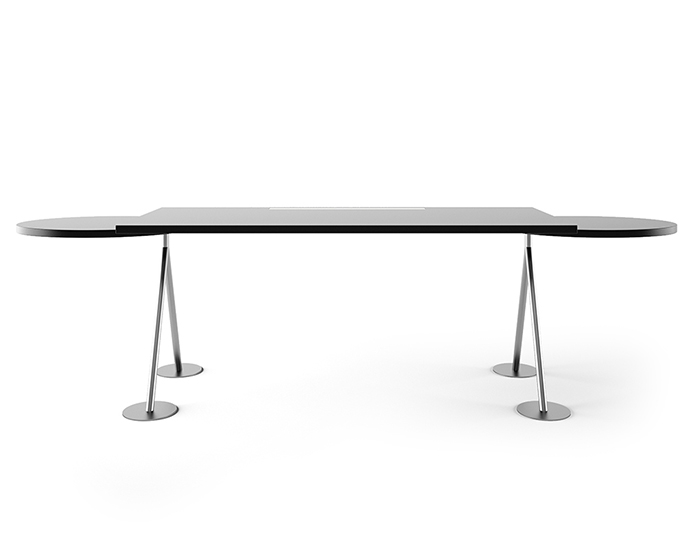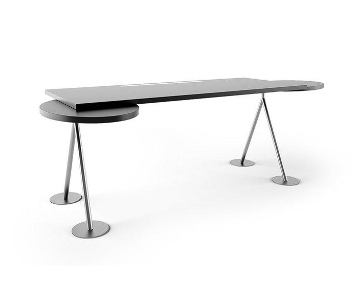 Scrivania in acciaio inox con piano laccato opaco nero grafite , vassoi ovali orientabili e listello prese luce a scomparsa