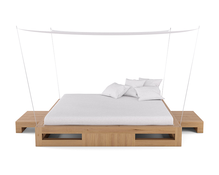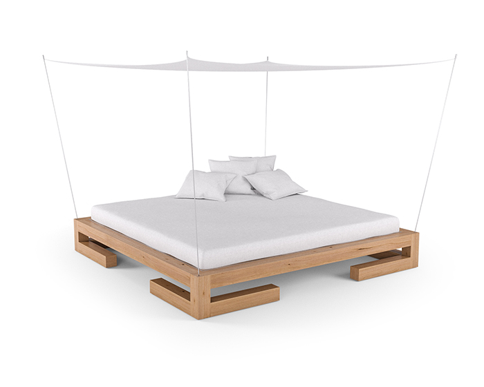 Isola relax in legno di teak con tavolini estraibili. Tessuto materasso e cuscini: lino per esterni color panna. Tessuto parasole sintetico bianco.
