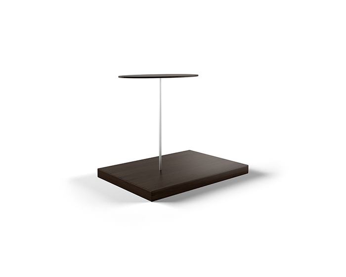Tavolino con base in legno di rovere tinto wengè, piano (ellittico) e gamba ferro satinato