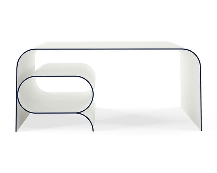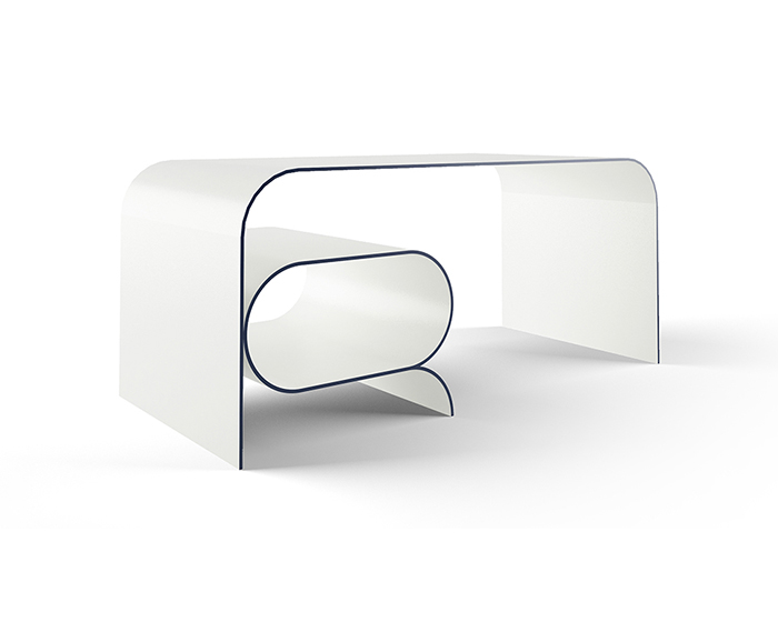 Scrivania in ferro verniciato opaco bianco con bordino frontale blu
