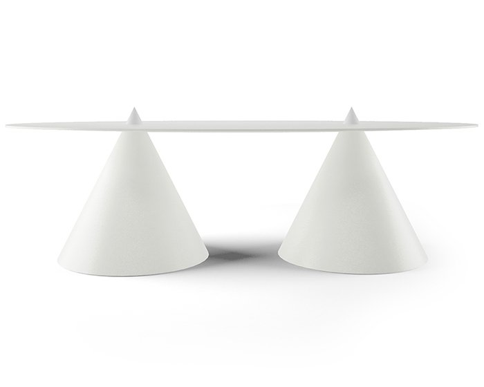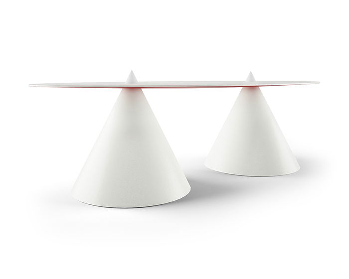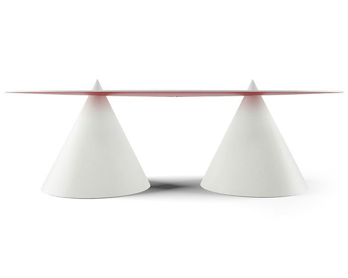 Tavolo in ferro verniciato opaco bianco con piano (ellittico) in legno di faggio laccato opaco bianco (sopra) e vinaccia (sotto).Coni superiori rimovibili