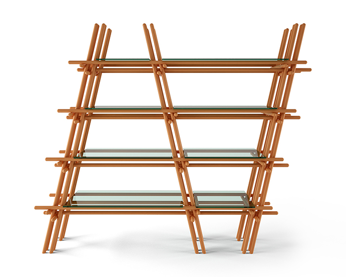 Scaffale in legno di faggio con ripiani vetro trasparente