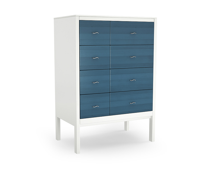 Settimino laccato opaco bianco con frontali in legno di faggio tinto azzurro , piano laccato opaco bianco e maniglie acciaio inox