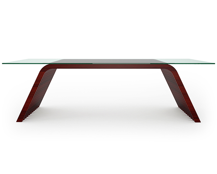 Scrivania in legno di padouk africano con piano vetro trasparente