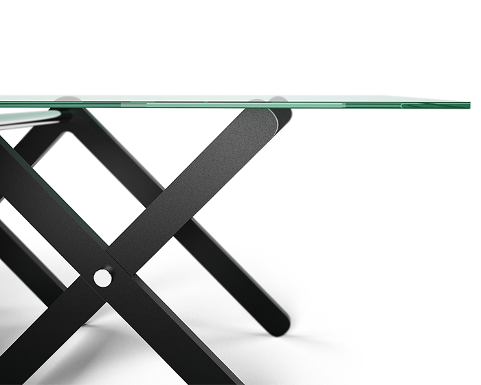 Tavolo in legno di faggio laccato opaco nero grafite con tubi acciaio inox e piano vetro trasparente