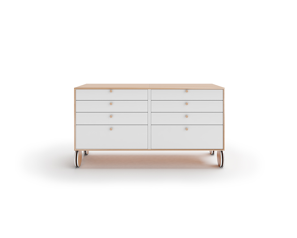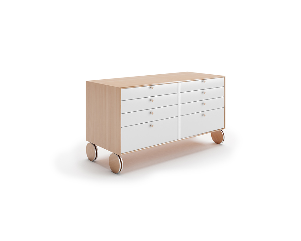 Cassettone in legno di faggio con ante laccate bianco. Ruote supporto in acciaio con finitura faggio.