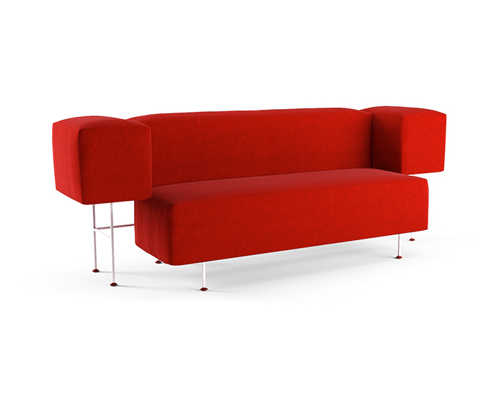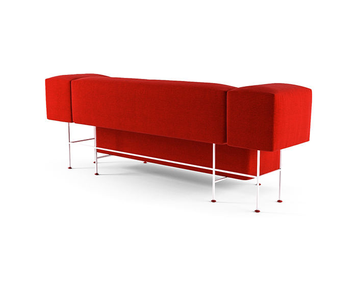 Divano rivestito in tessuto canapone colore rosso carminio con piedi ferro verniciato opaco bianco