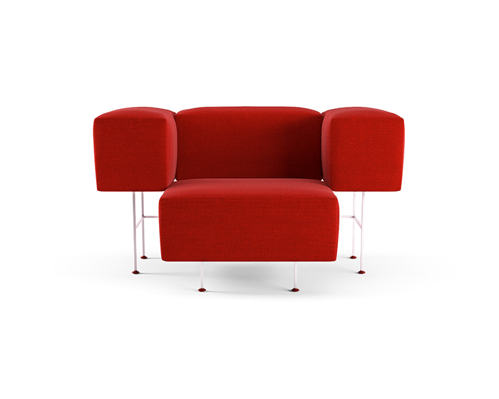 Poltrona rivestita in tessuto canapone colore rosso carminio con piedi ferro verniciato opaco bianco