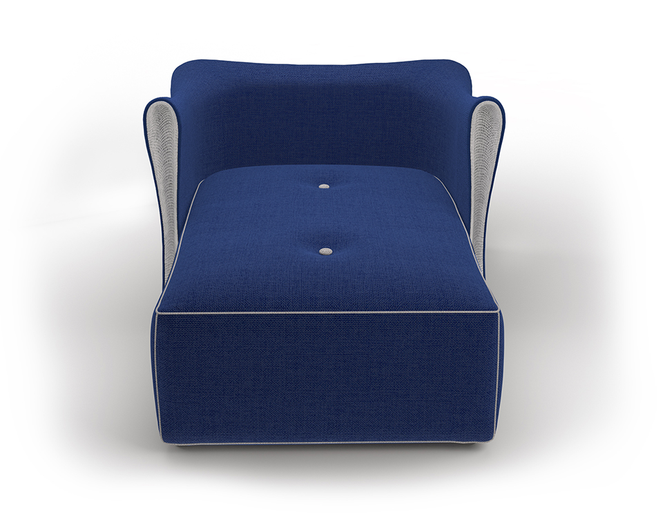 Poltrona Lunga tessile in lino con impunture a contrasto e bottoni in tessuto. Risvolto tessuto interno accoppiato a contrasto.