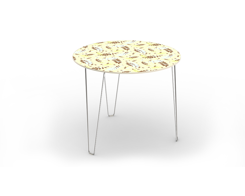 Finiture: Struttura: Acciaio o Ferro verniciato opaco a polvere epossidica. Piano: Laminato stampato in digitale.