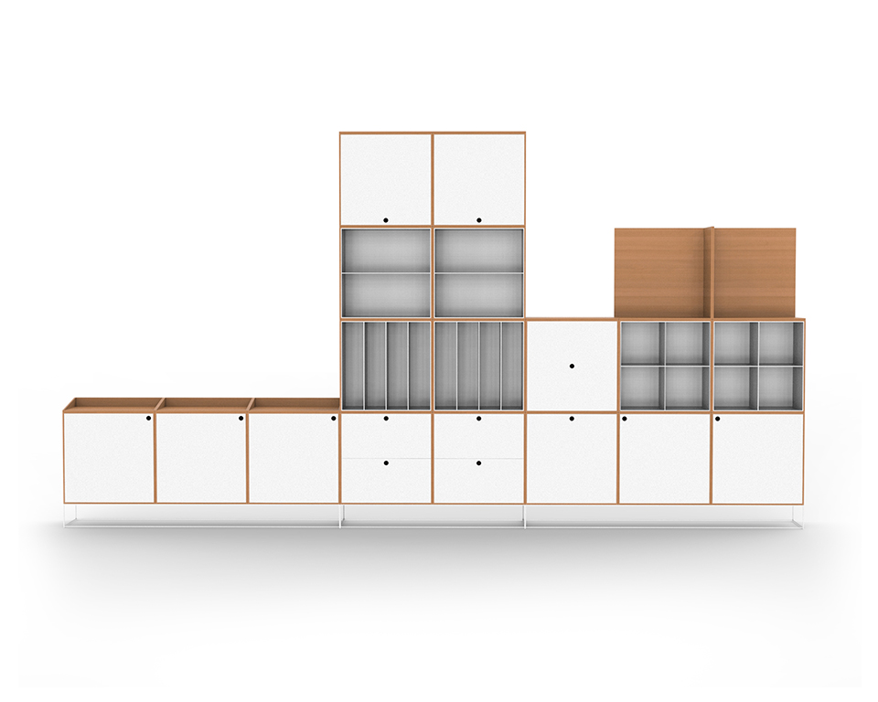 Scaffale attrezzato in faggio e frontali laccati bianco con telaio verniciato bianco