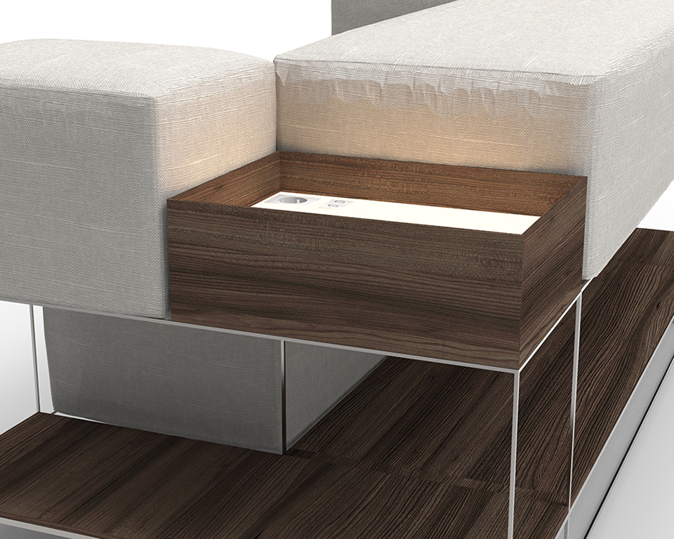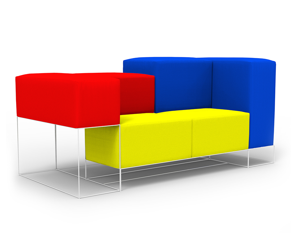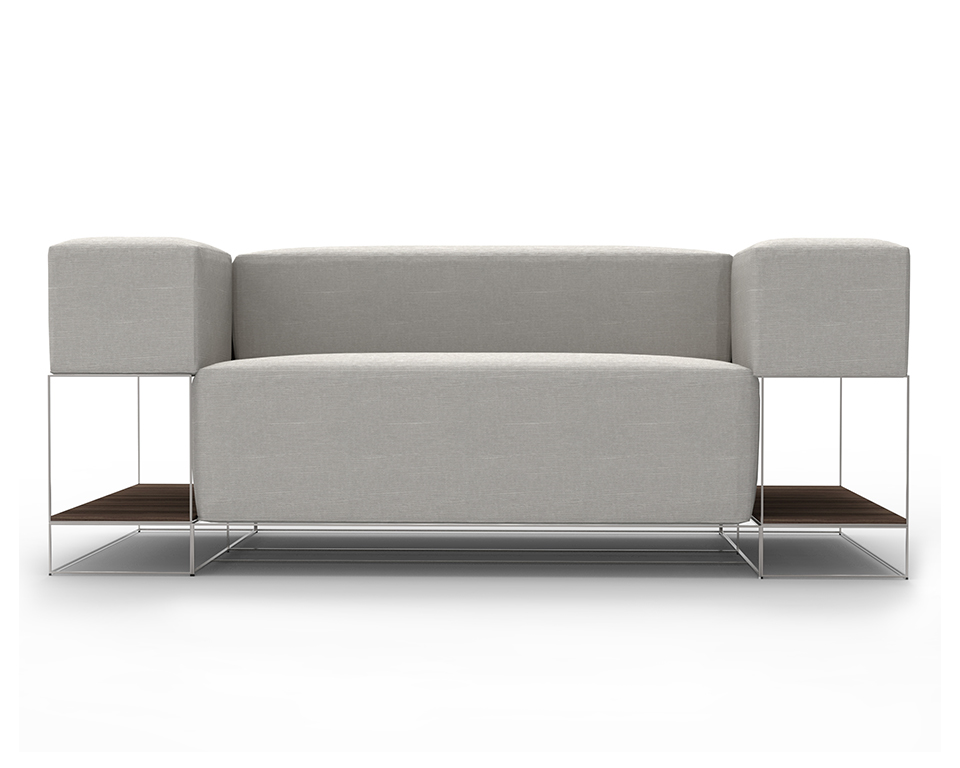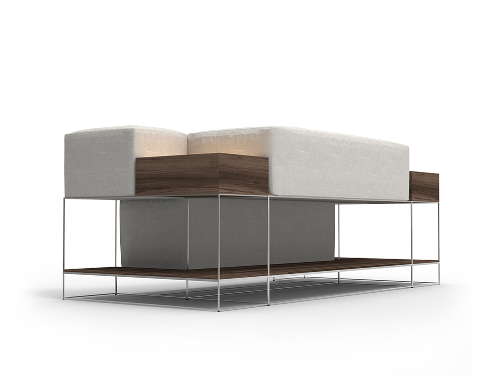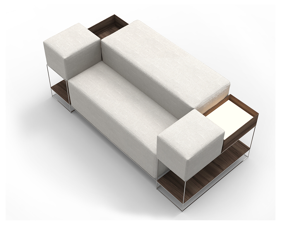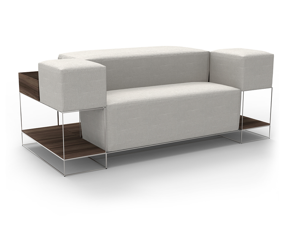 Finiture: Telaio: Acciaio, Ferro verniciato opaco. Pianetti e Box: Legno, laminato, laccato opaco, nobilitato melaminico, vetro trasparente o retroverniciato. Tessuto e Pelle.