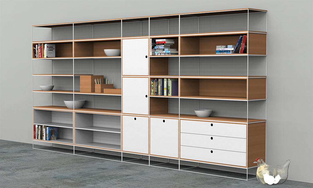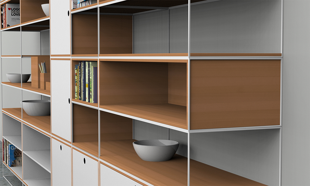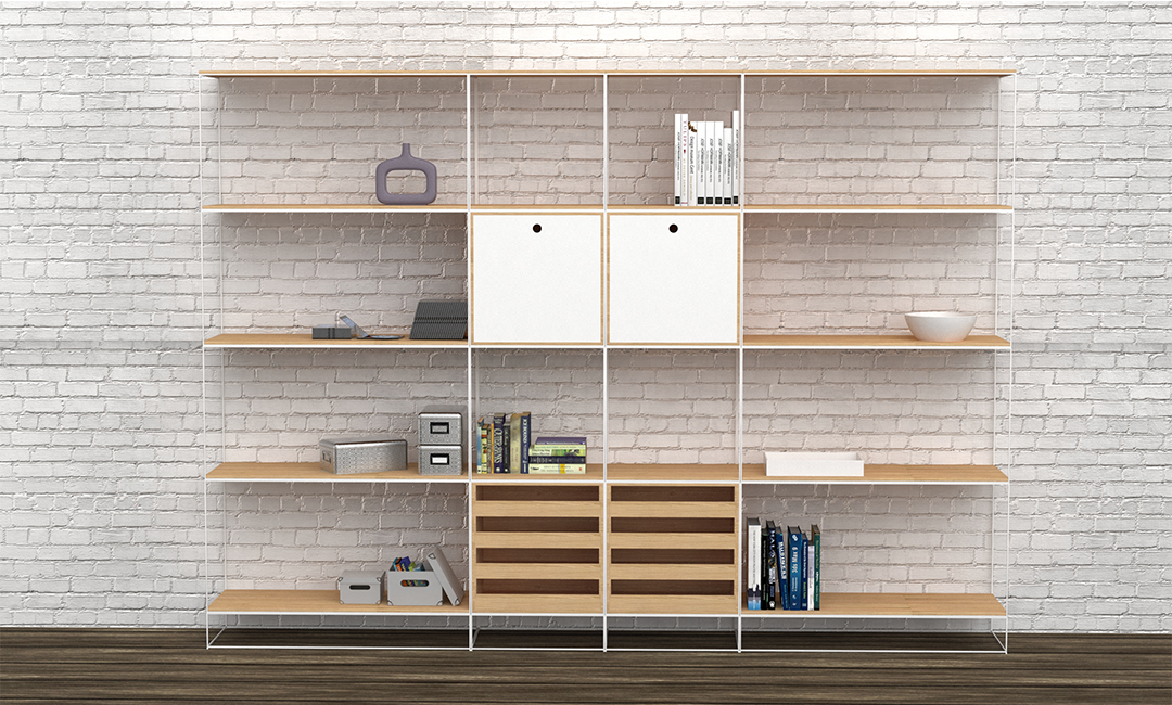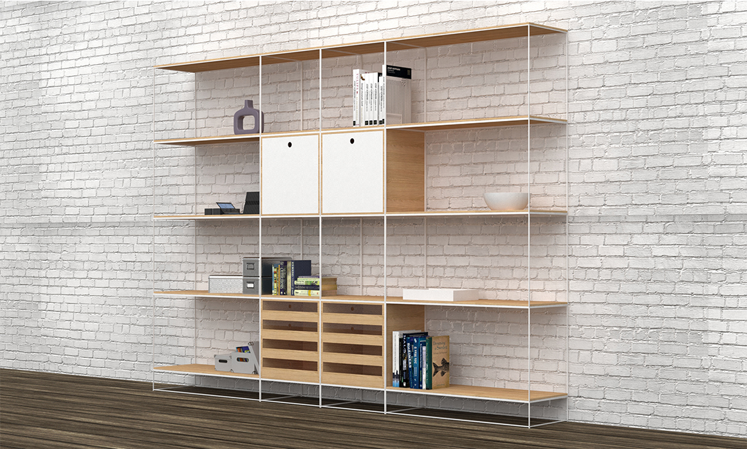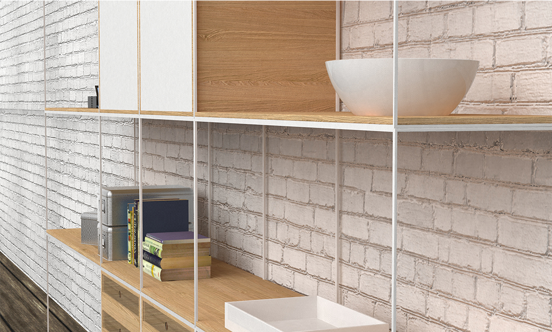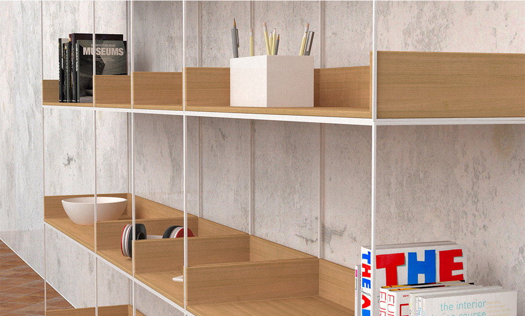 Serie di scaffali e pareti attrezzate con il Sistema Inner: una estrema possibilità di attrezzare il Telaio con i più svariati elementi.