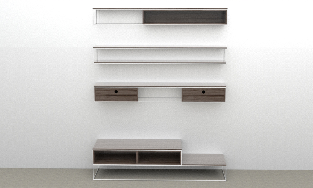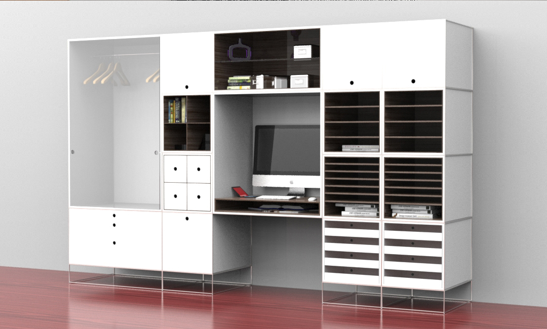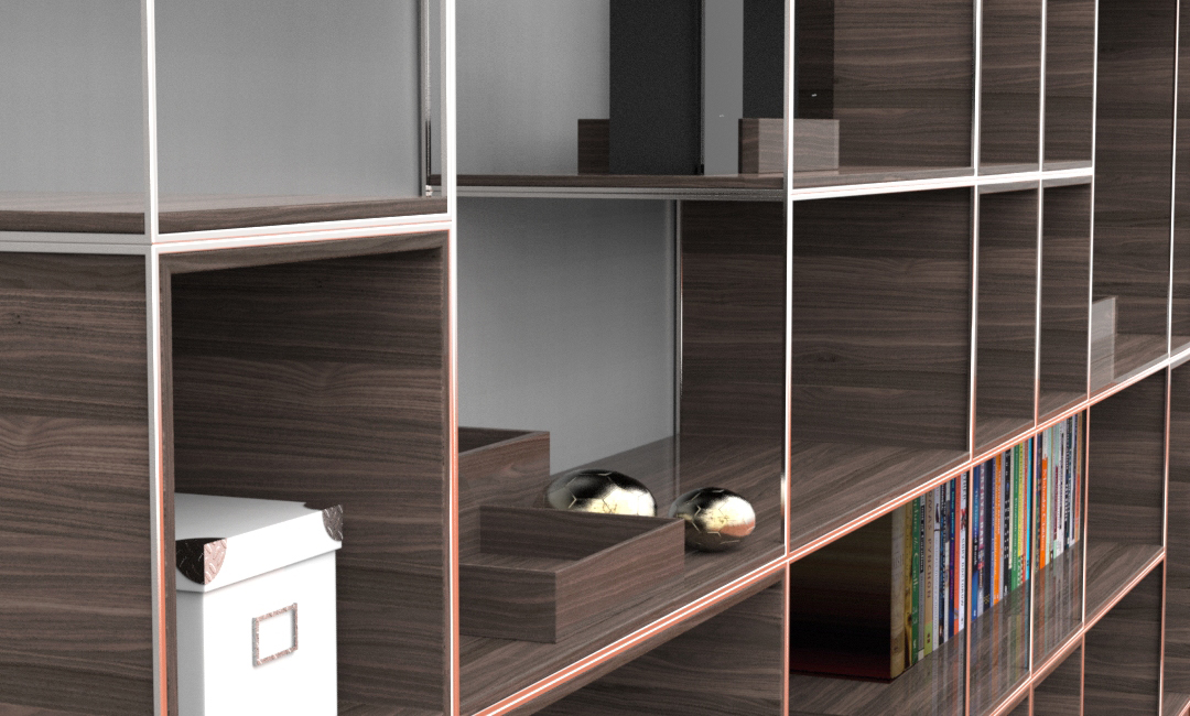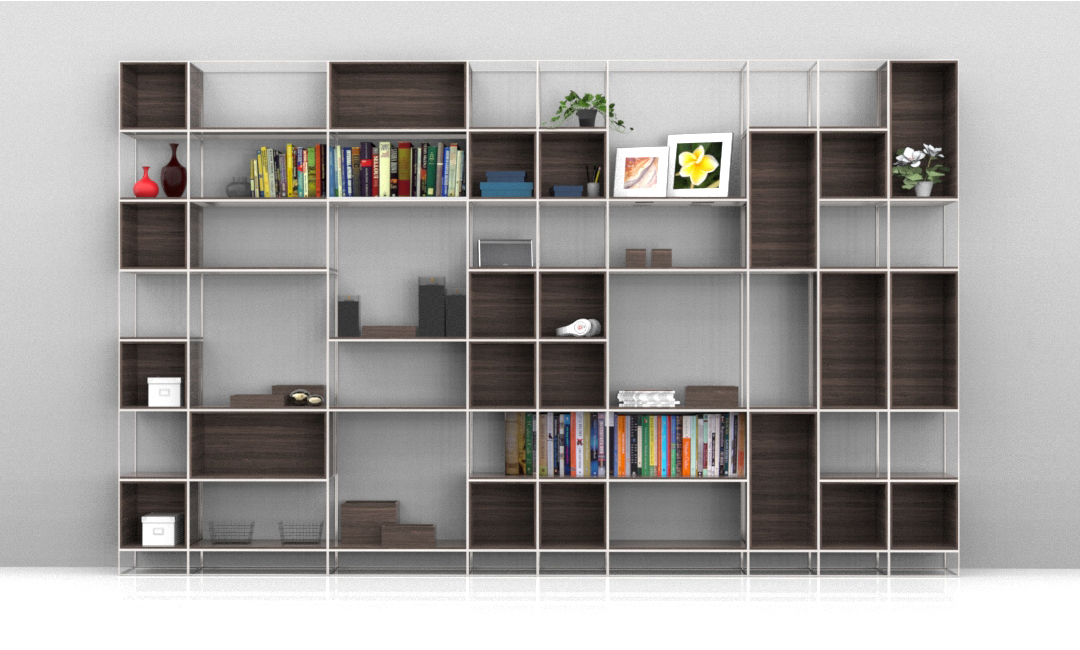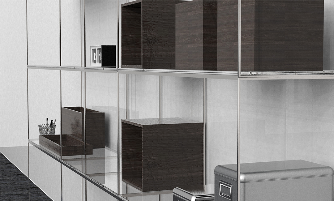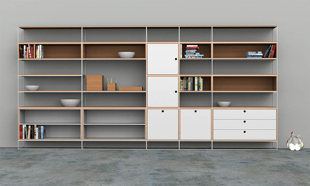 Serie di scaffali e pareti attrezzate con il Sistema Inner: una estrema possibilità di attrezzare il Telaio con i più svariati elementi.