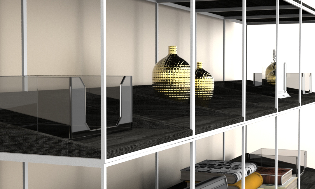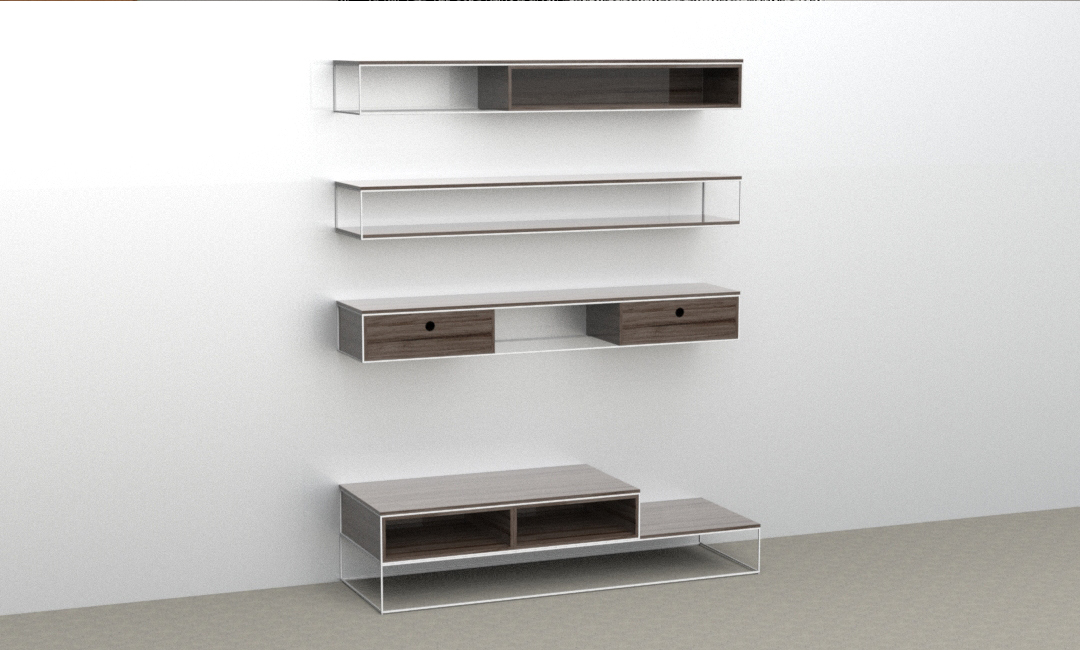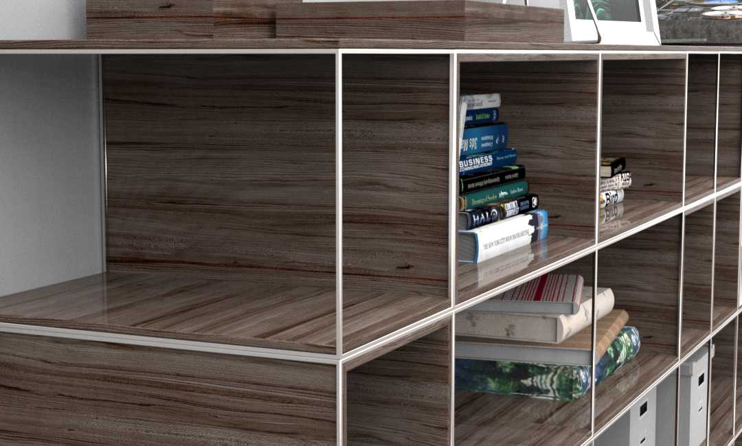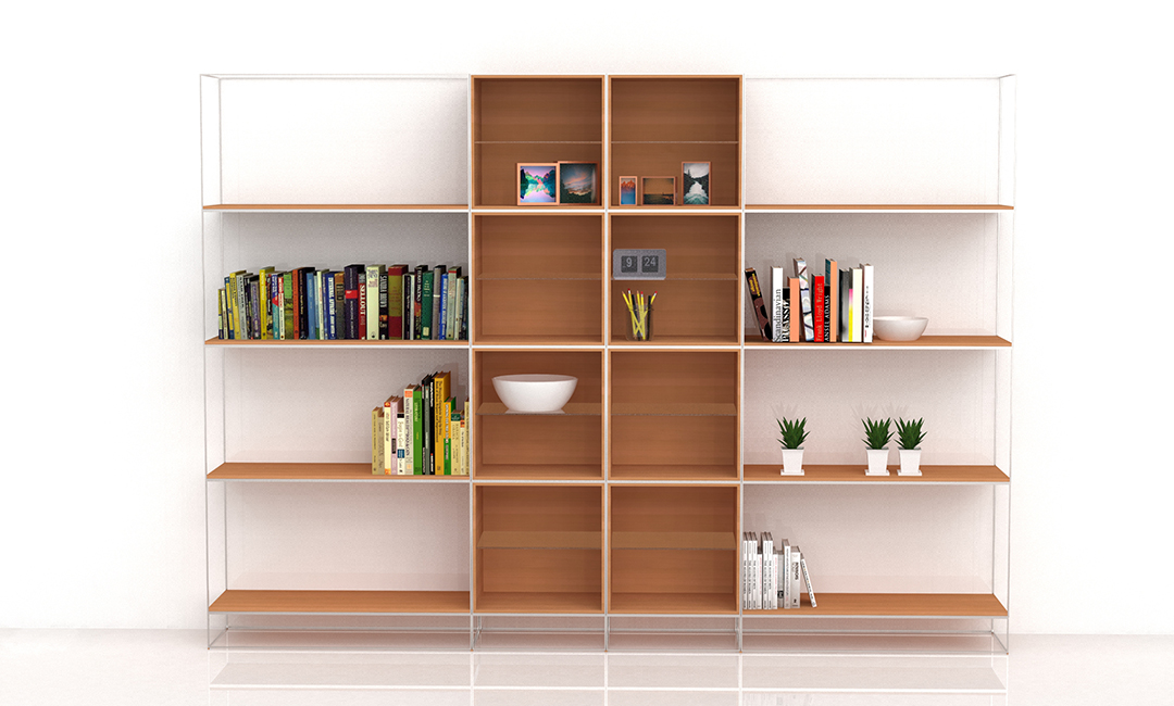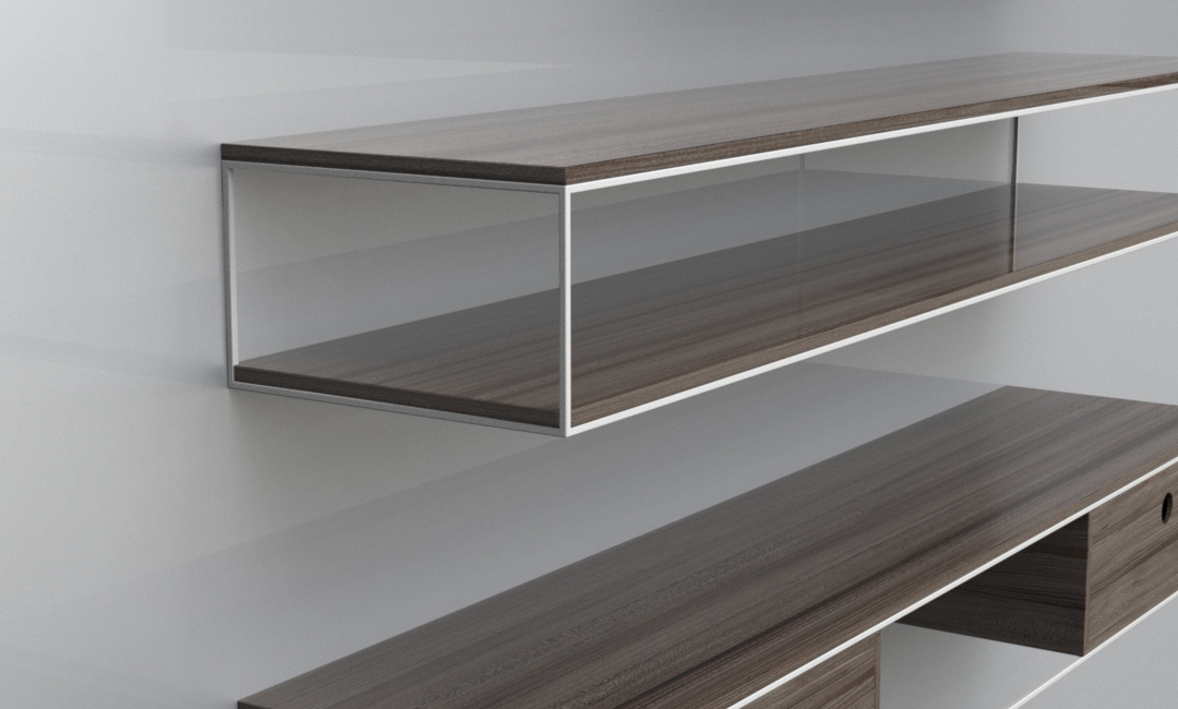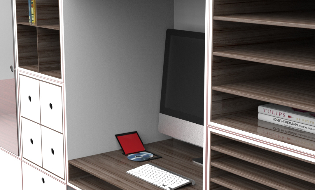 Serie di scaffali e pareti attrezzate con il Sistema Inner: una estrema possibilità di attrezzare il Telaio con i più svariati elementi.