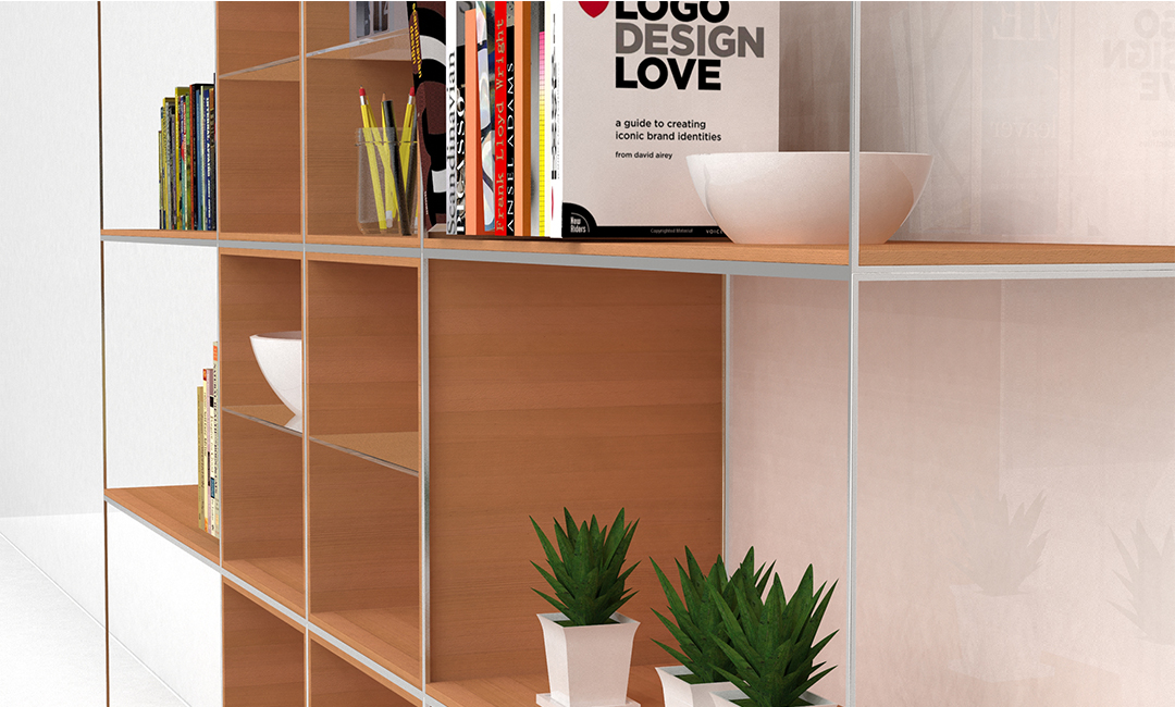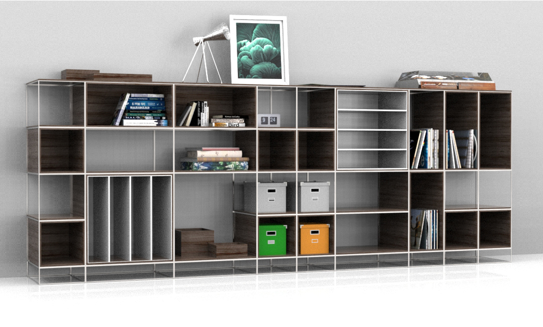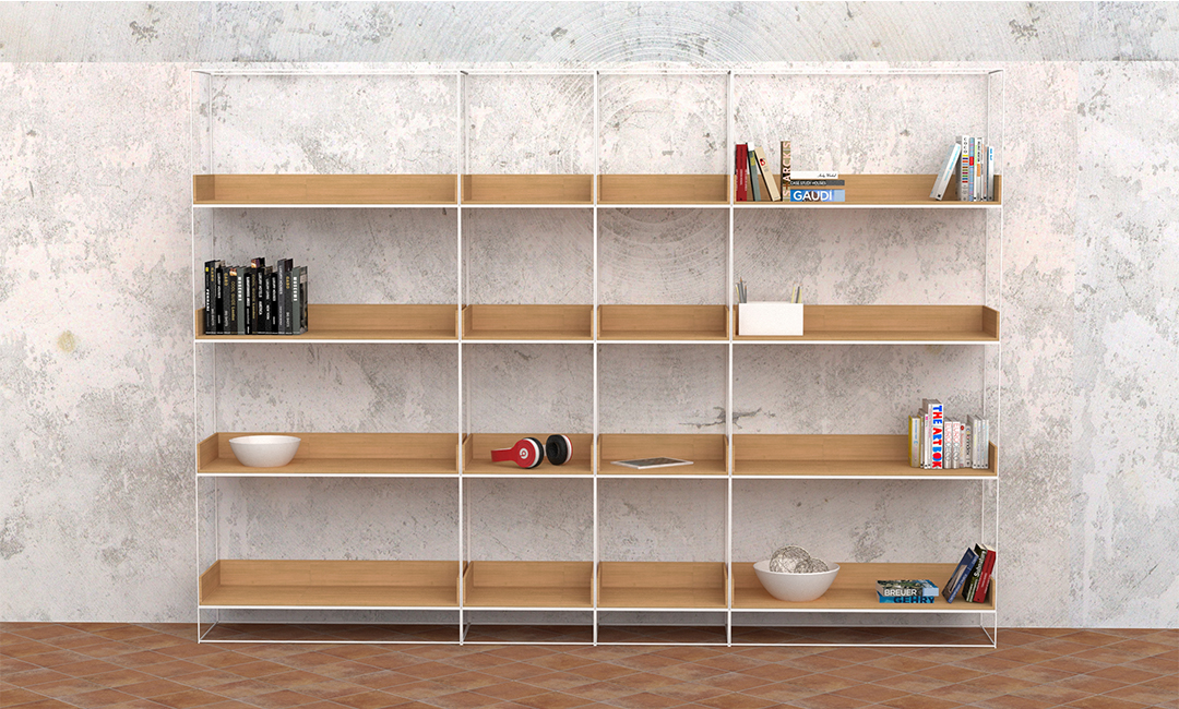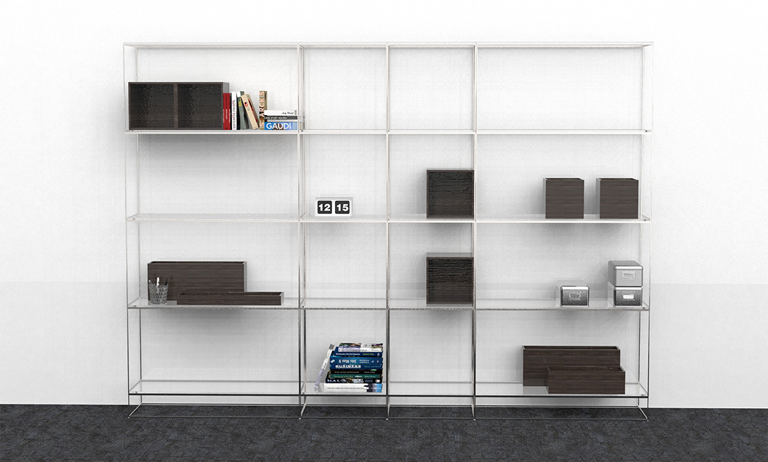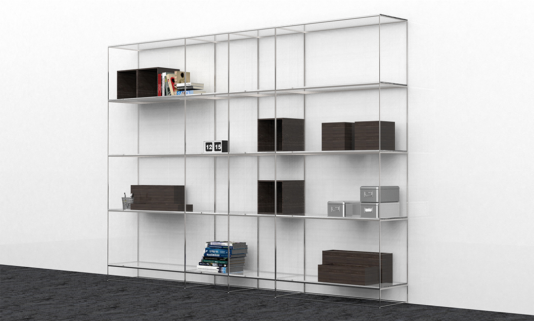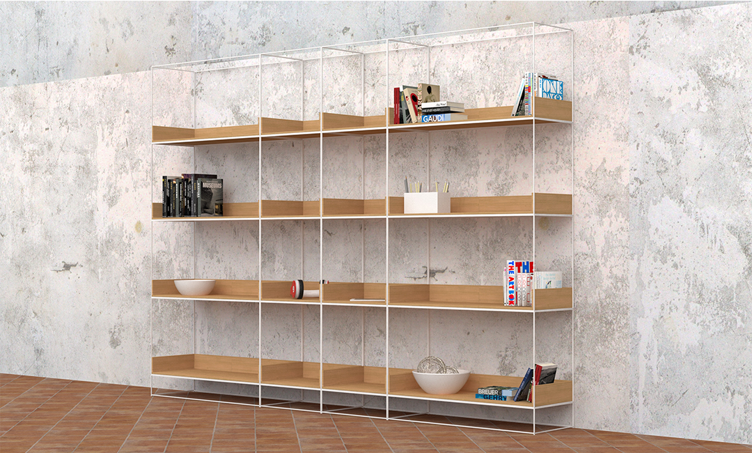 La struttura in metallo dei telai consente di costruire dei reticoli dalle infinite possibilità e gli elementi box, pianetti e imbottiti permettono di ottenere le funzioni più disparate: scaffali e tavoli, la cucina, i divani, gli elementi per la camera. Gli elementi possono essere ricomposti e ricollocati grazie a semplici operazioni di affiancamento e sovrapposizione. Pulizia delle linee e volumi ridotti restituiscono un risultato estetico fresco e leggero.