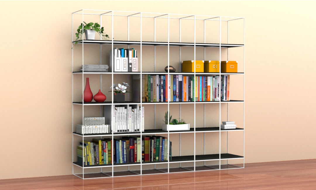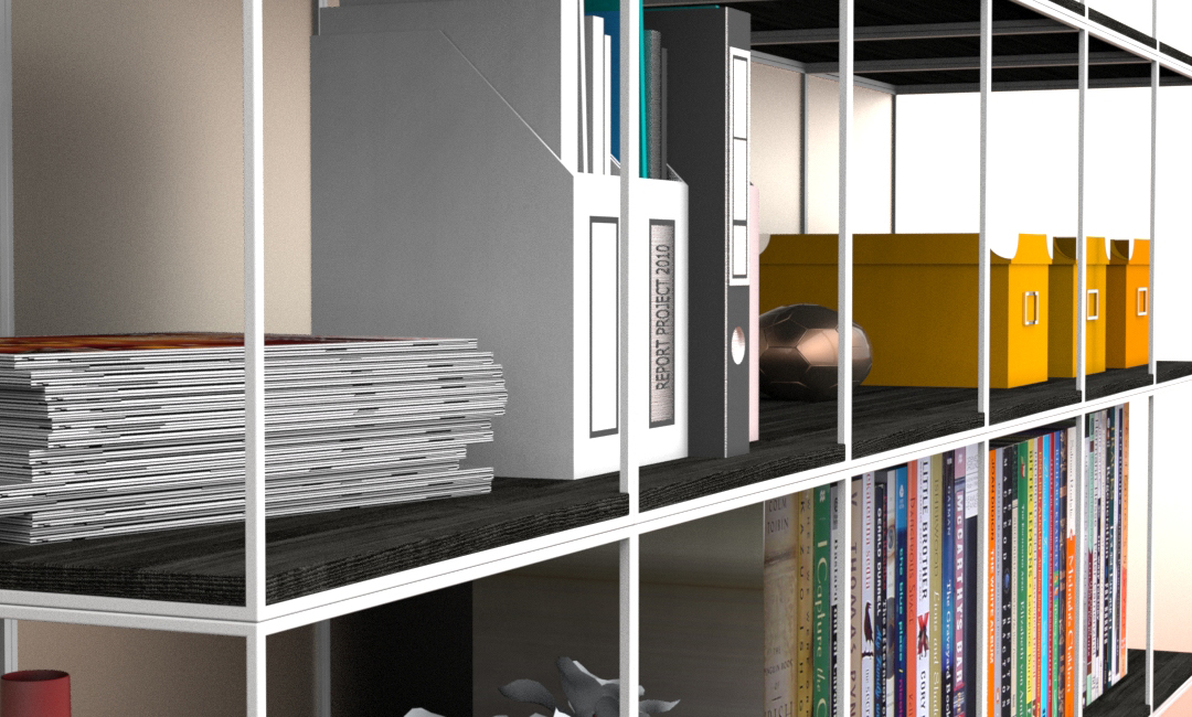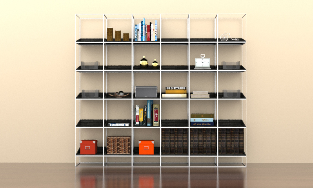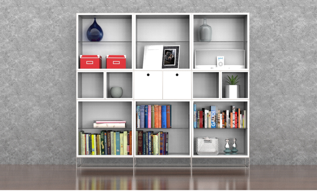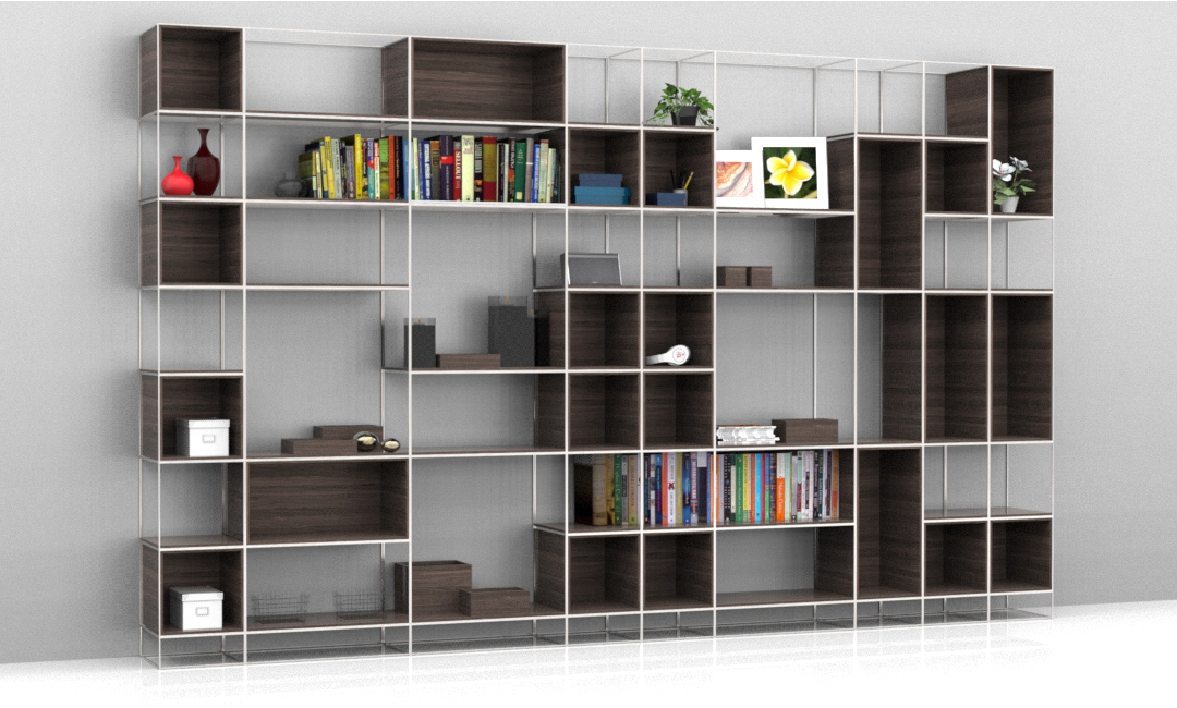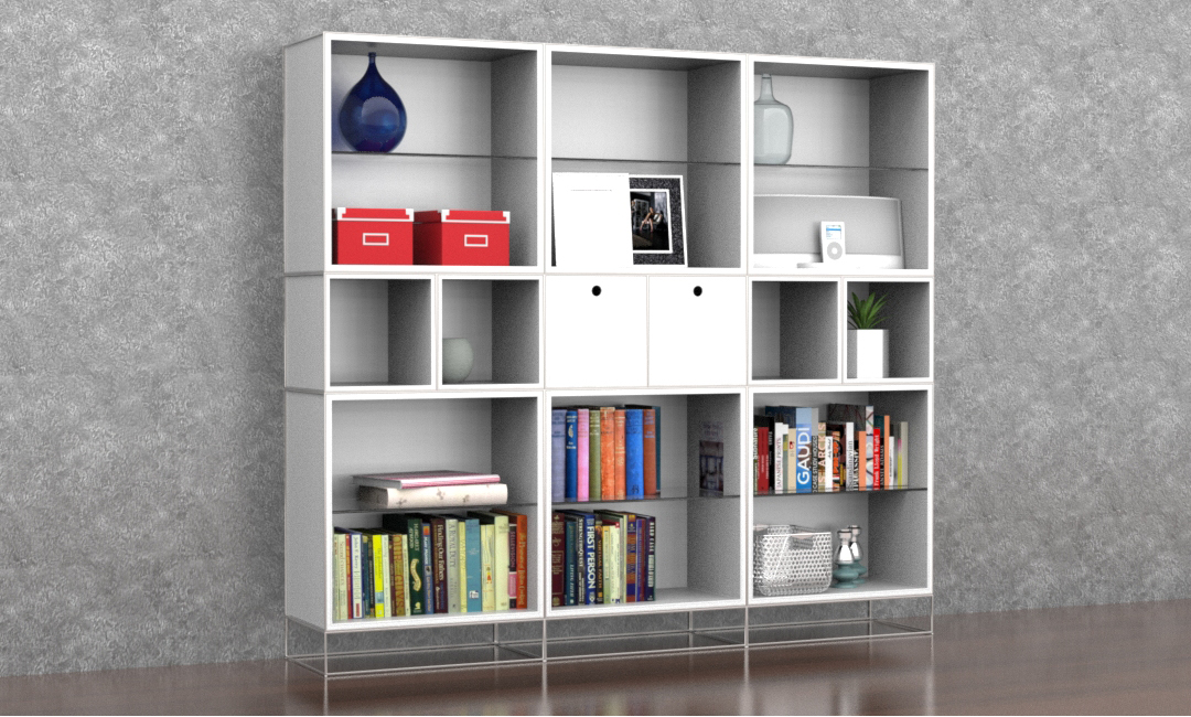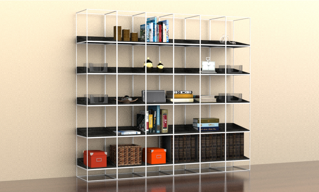 La struttura in metallo dei telai consente di costruire dei reticoli dalle infinite possibilità e gli elementi box, pianetti e imbottiti permettono di ottenere le funzioni più disparate: scaffali e tavoli, la cucina, i divani, gli elementi per la camera. Gli elementi possono essere ricomposti e ricollocati grazie a semplici operazioni di affiancamento e sovrapposizione. Pulizia delle linee e volumi ridotti restituiscono un risultato estetico fresco e leggero.
