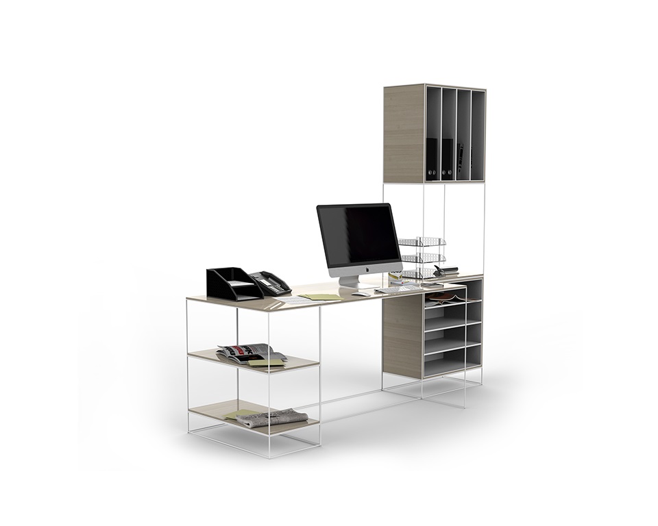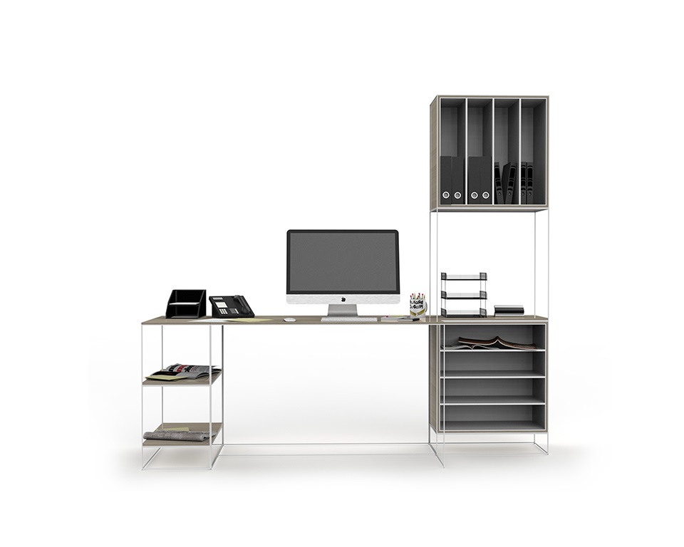Finiture: Telaio: Acciaio, Ferro verniciato opaco. Pianetti e Box: Legno, laminato, laccato opaco, nobilitato melaminico, vetro trasparente o retroverniciato.