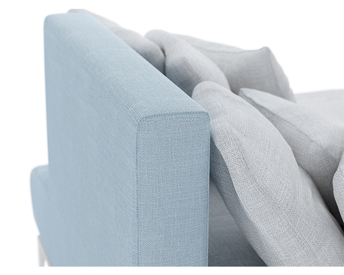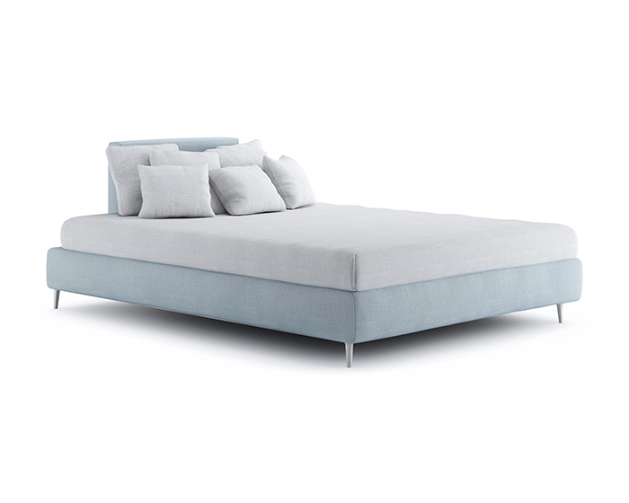 Letto imbottito rivestito in tessuto canapone celeste polvere (sfoderabile) con piedi ferro satinato