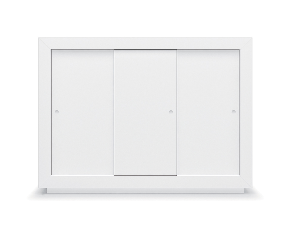 Credenza in laccato bianco con ante scorrevoli. Ripiani interno vetro