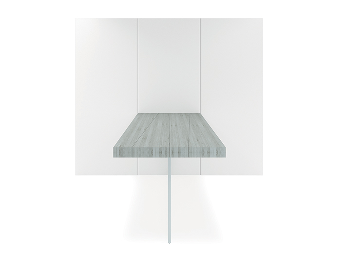 Bancone con Boiserie in frassino verniciato ardesia e supporto in vetro verniciato bianco (variante con piano Speciale in rovere sbiancato)