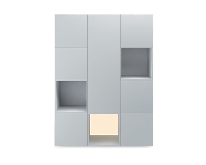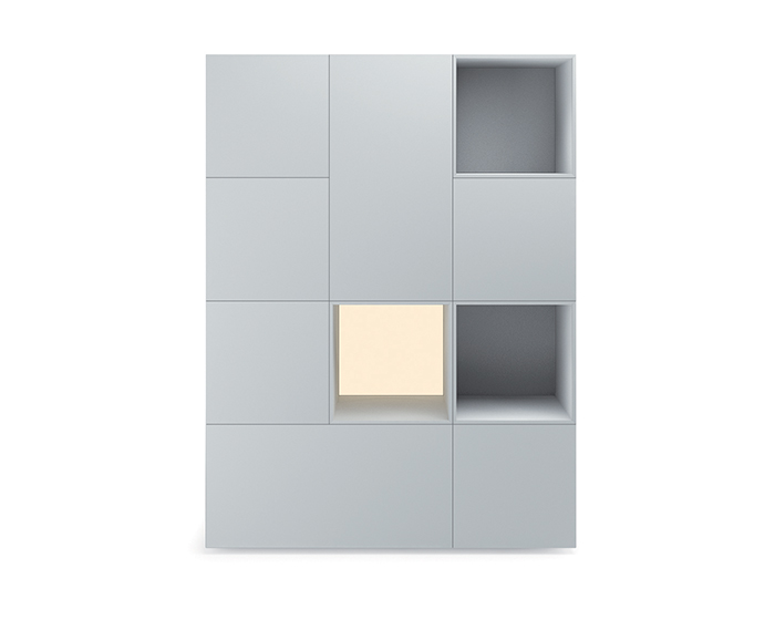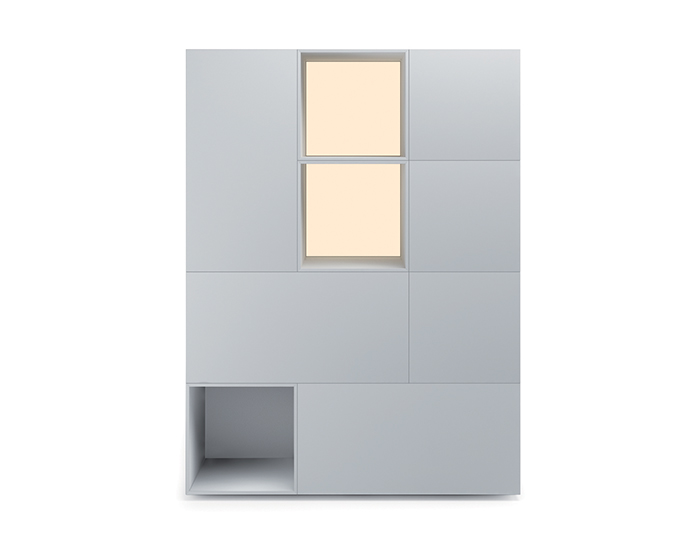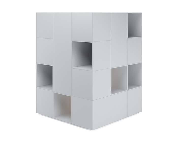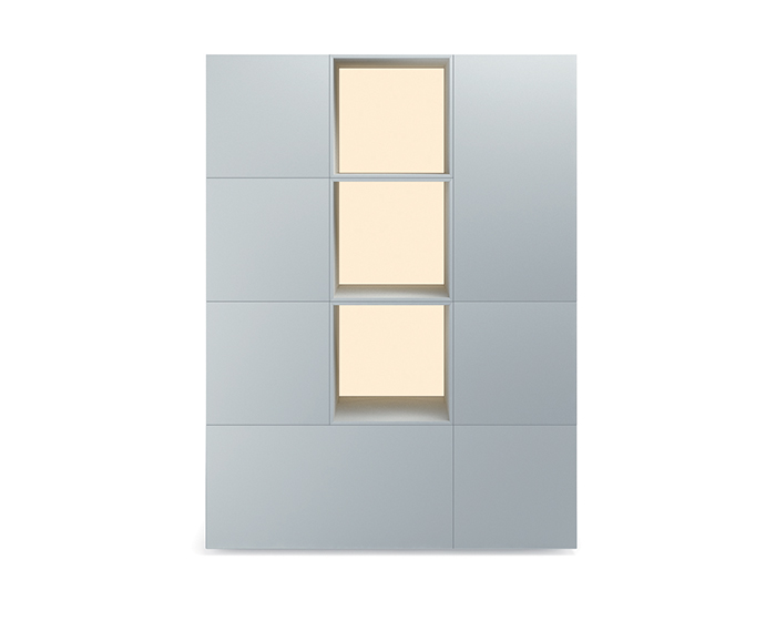 Mobile contenitore ad isola laccato opaco bianco con schiene bussolotti a giorno in vetro opalino illuminato a led