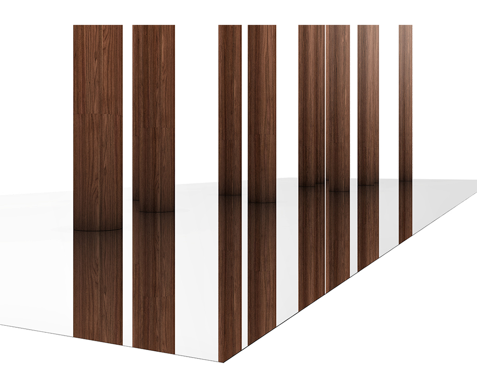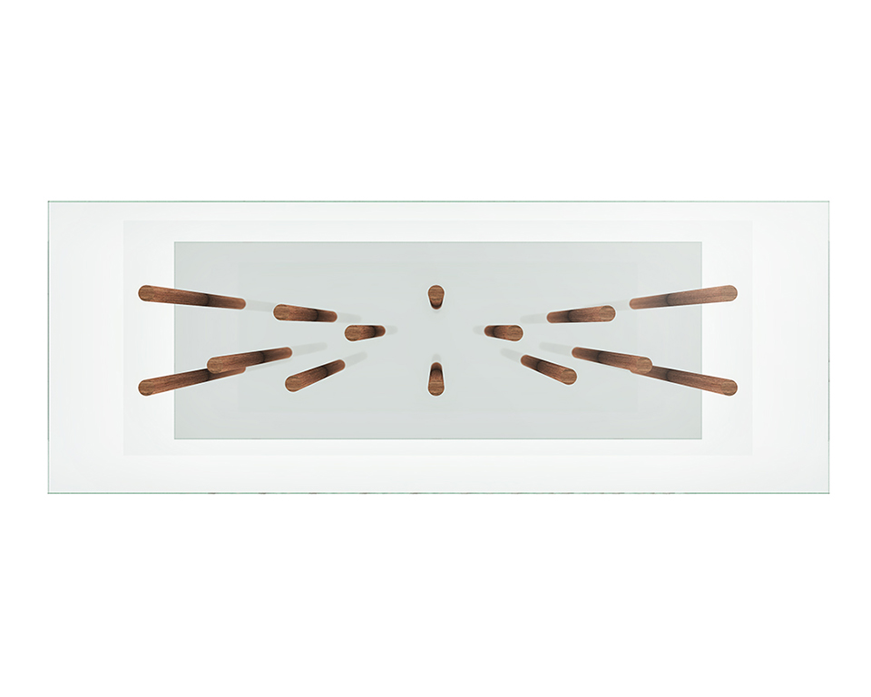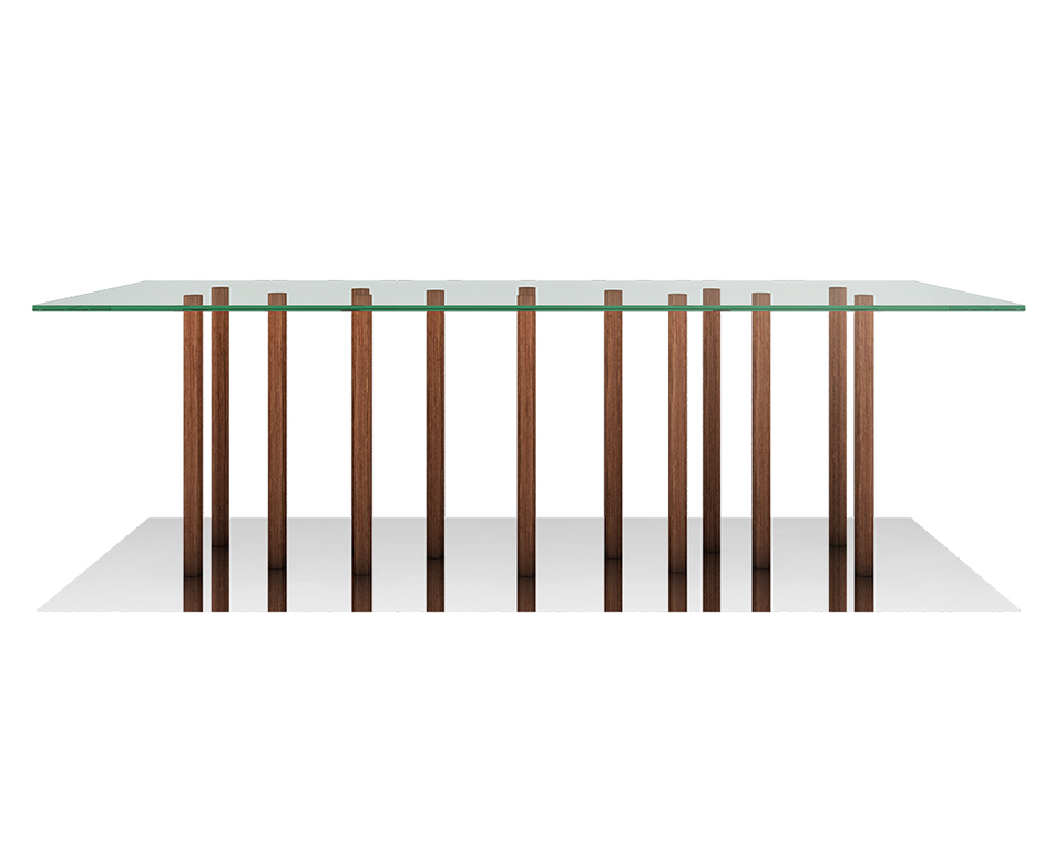 Tavolo con gambe in legno laccato bordeaux con piano vetro trasparente e base in metallo a specchio