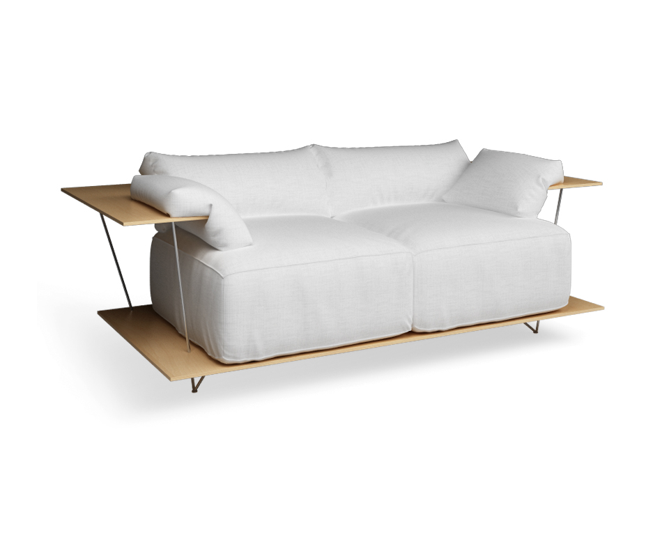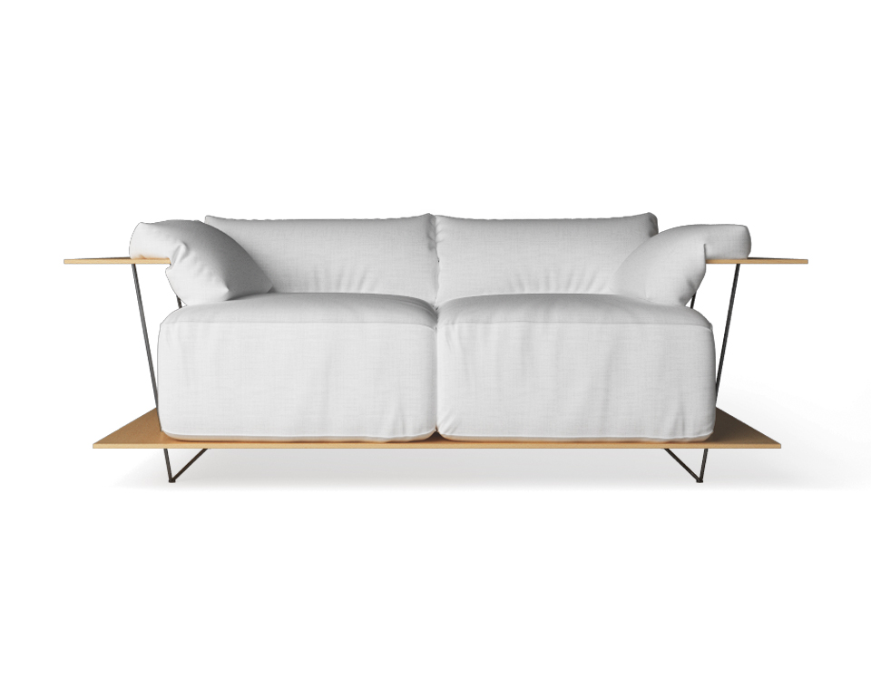 Divano 2posti in faggio con struttura in acciaio e cuscini in lino bianco