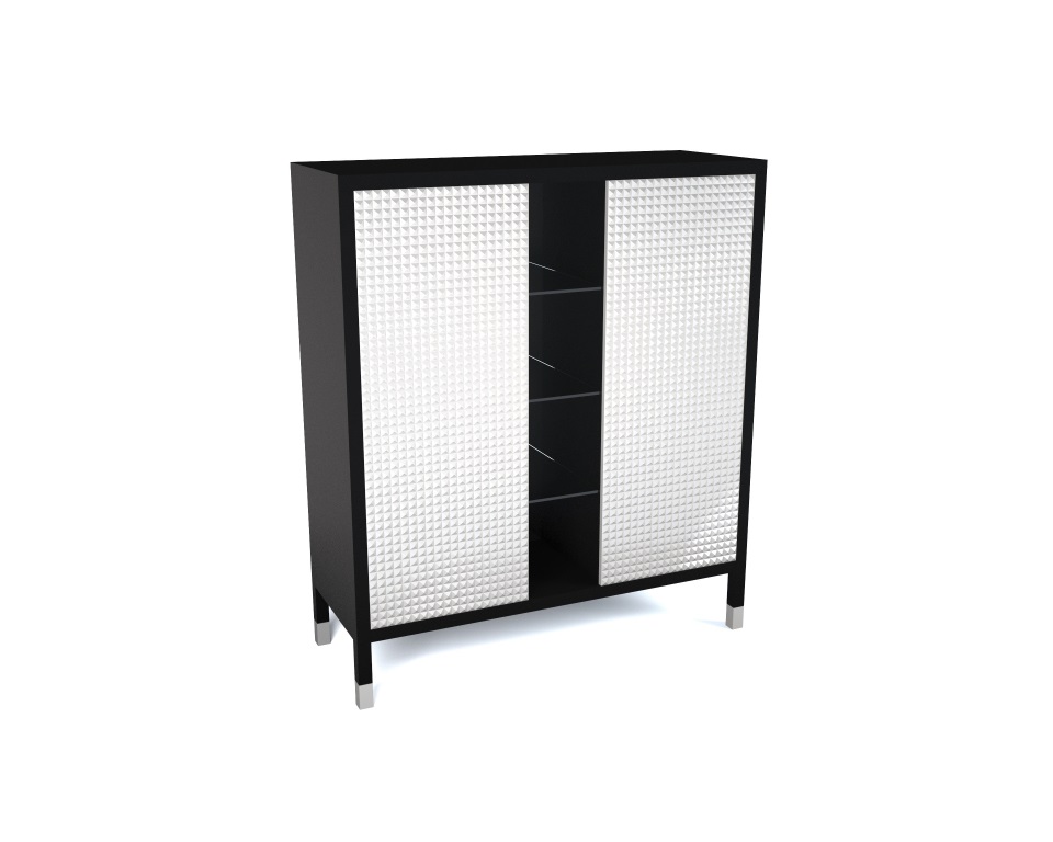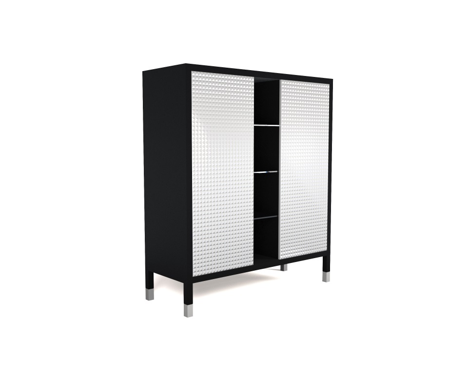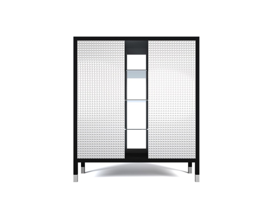 Credenza con fondo a specchio o in vetro opalino luminoso, laccata nero opaco e bianco