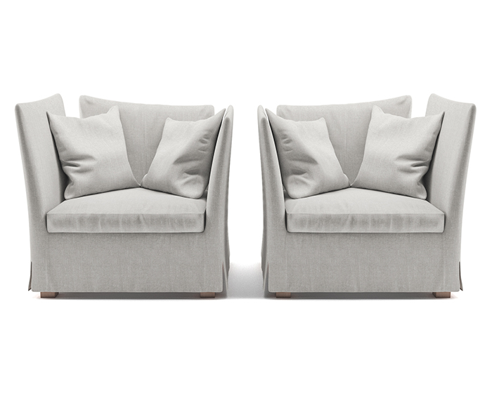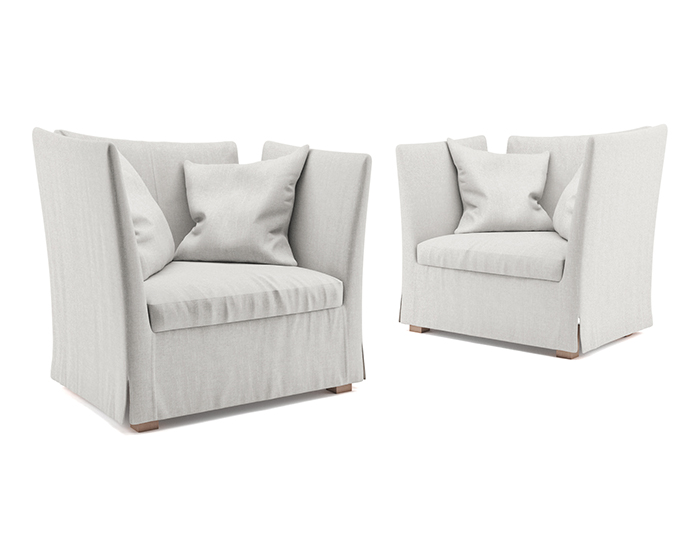 Poltrona rivestita in lino colore crema con piedi in legno di faggio – Versione con vestito lungo in lino colore bianco