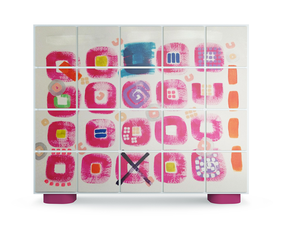 Mobile laccato bianco con ante in laminato stampato in digitale. Finte ruote in metallo verniciato.