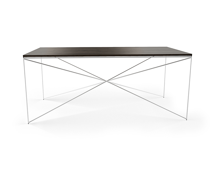 Tavolo in ferro satinato con piano in legno di rovere tinto wengè
