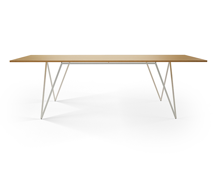 Tavolo in ferro verniciato opaco bianco con piano in legno di betulla