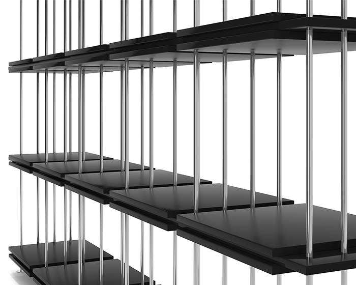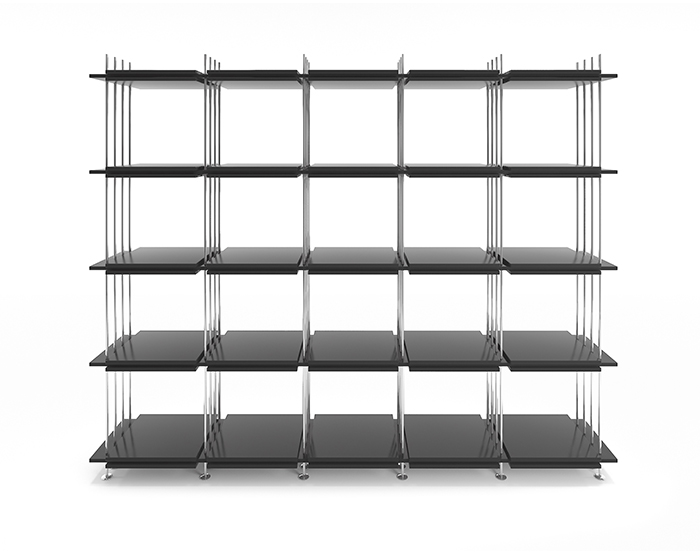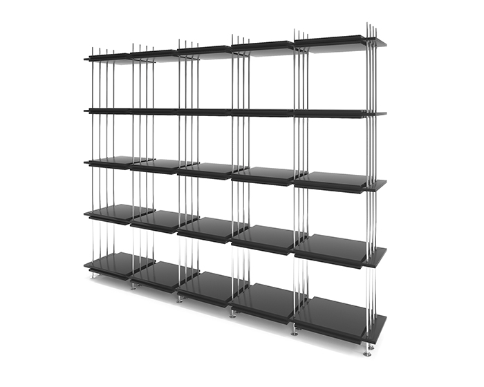 Scaffale con struttura acciaio inox e ripiani laccato opaco nero grafite