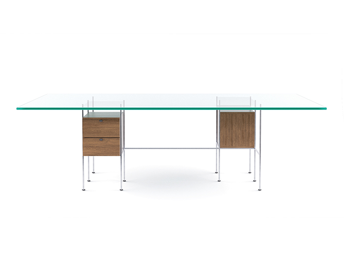 Scrivania con piano vetro trasparente, cassettiera in legno di noce europeo, gambe acciaio inox con piedini neri