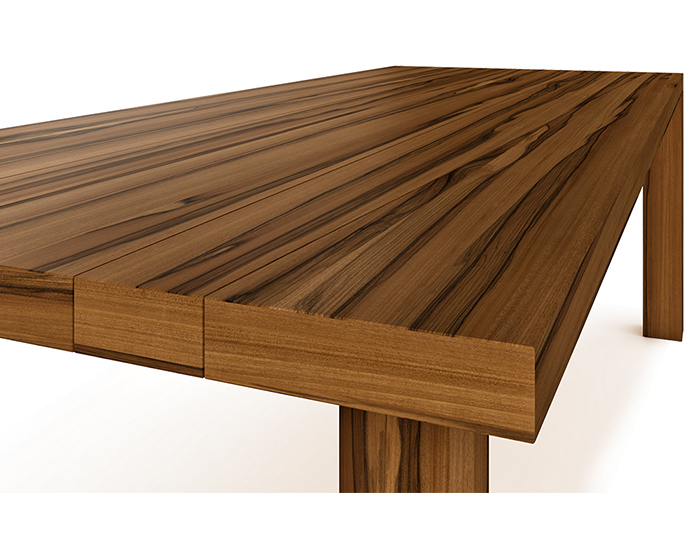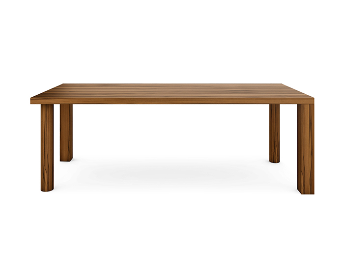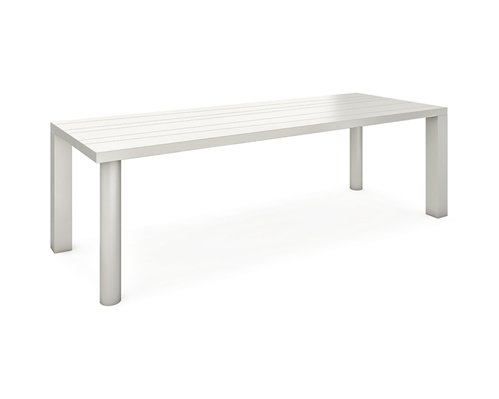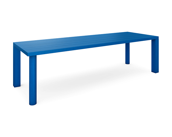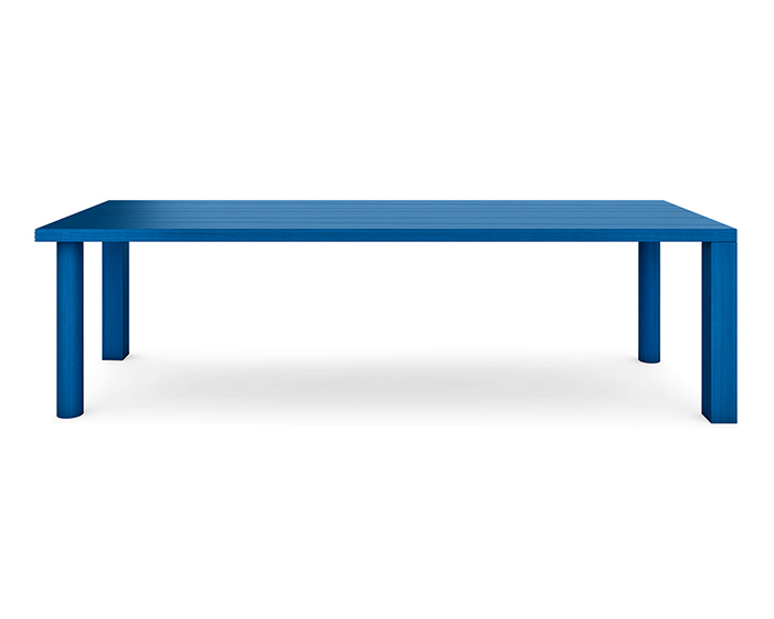 Tavolo in legno di noce peruviano (220), laccato bianco (245) e frassino verniciato azzurro (270).