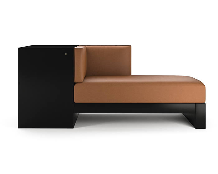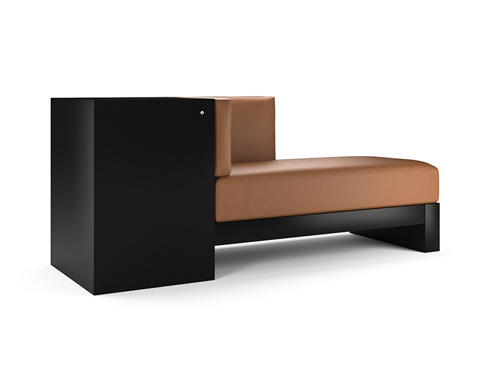 Mobile contenitore laccato nero grafite con seduta in pelle naturale colore cuoio