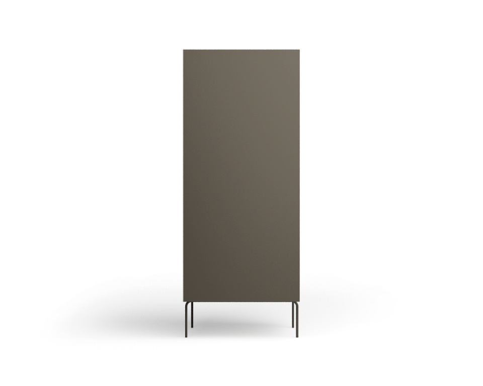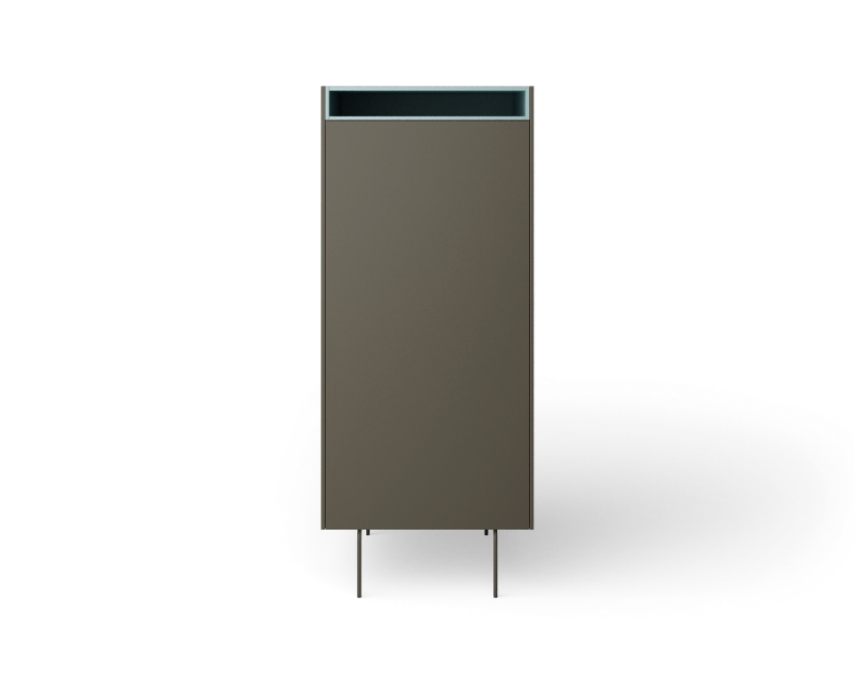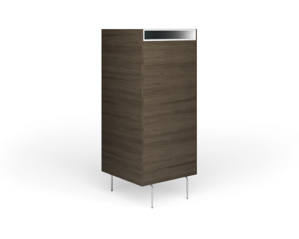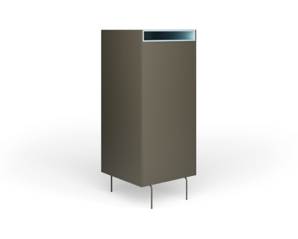 Box armadietto con un’anta e vano a giorno. Piede U alto cm. 20. Box fango-Vassoio polvere. Variante: Box olmo ossido-Vassoio bianco.