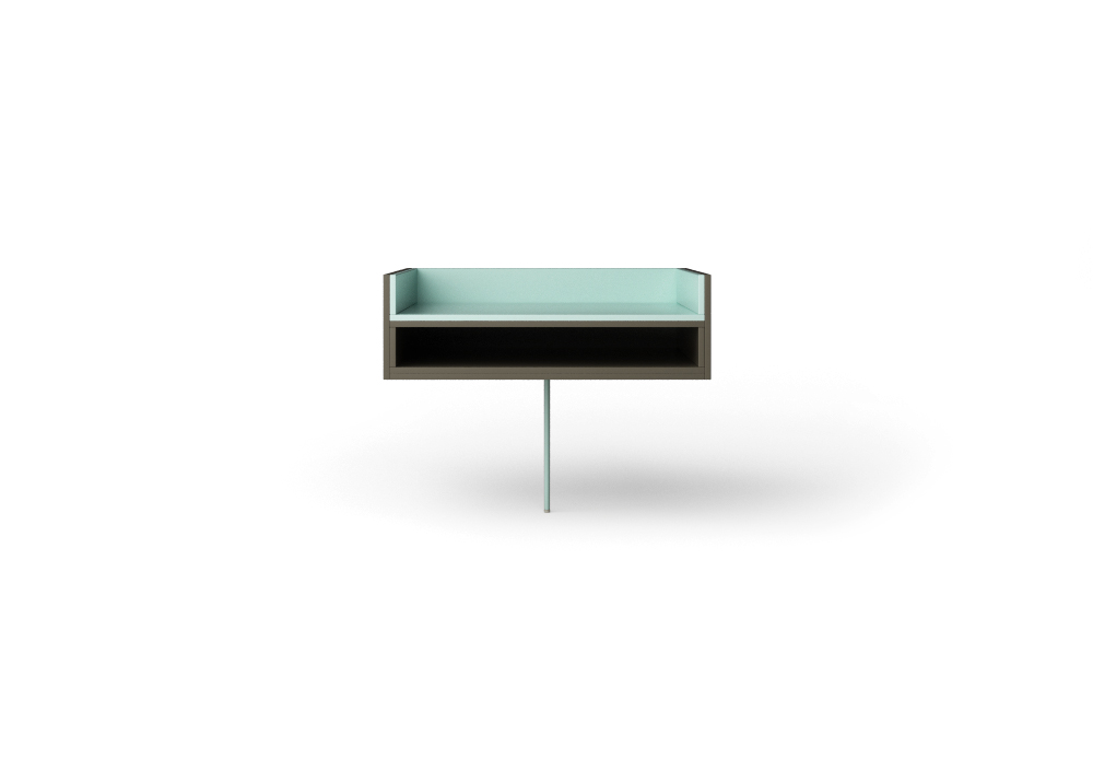 Comodino con vano a giorno. Box fango-Vassoio polvere. Variante: Box bianco-Vassoio azzurro.