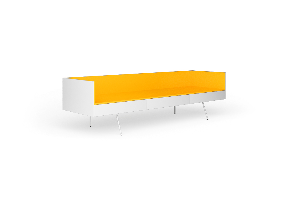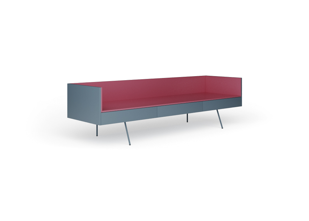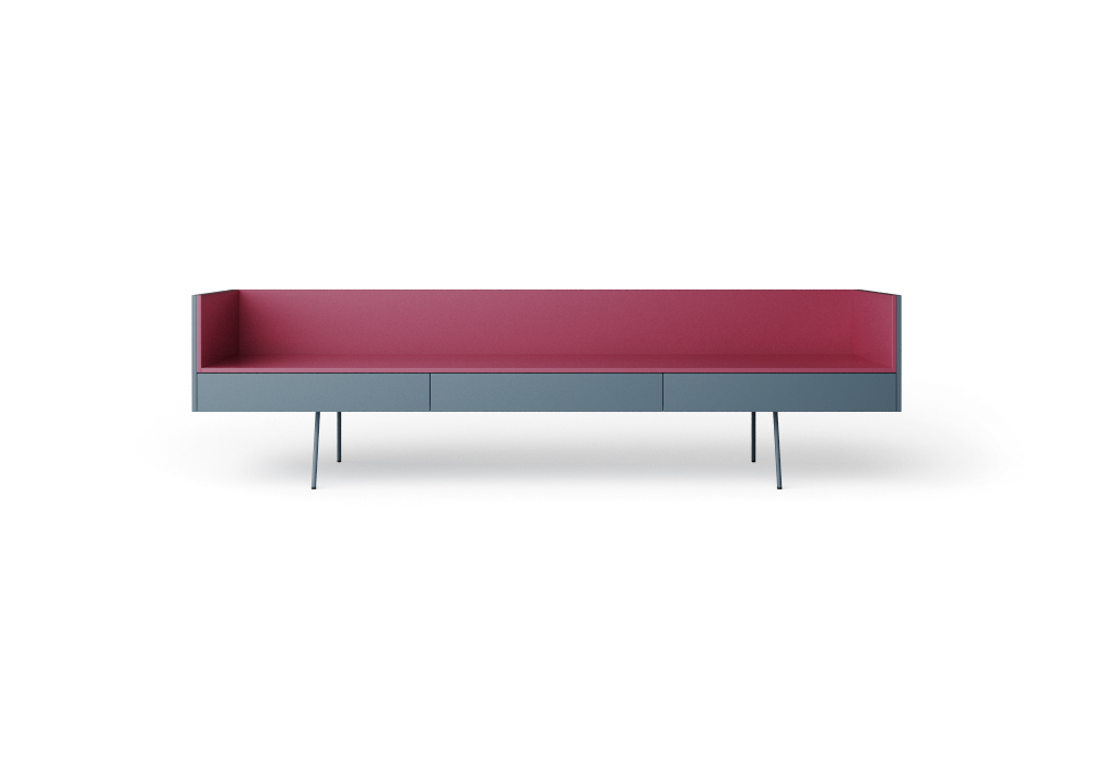 Base con tre cassetti. Piede K. Box avio-Vassoio lampone. Variante: Box bianco-Vassoio arancio.