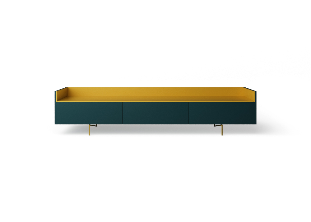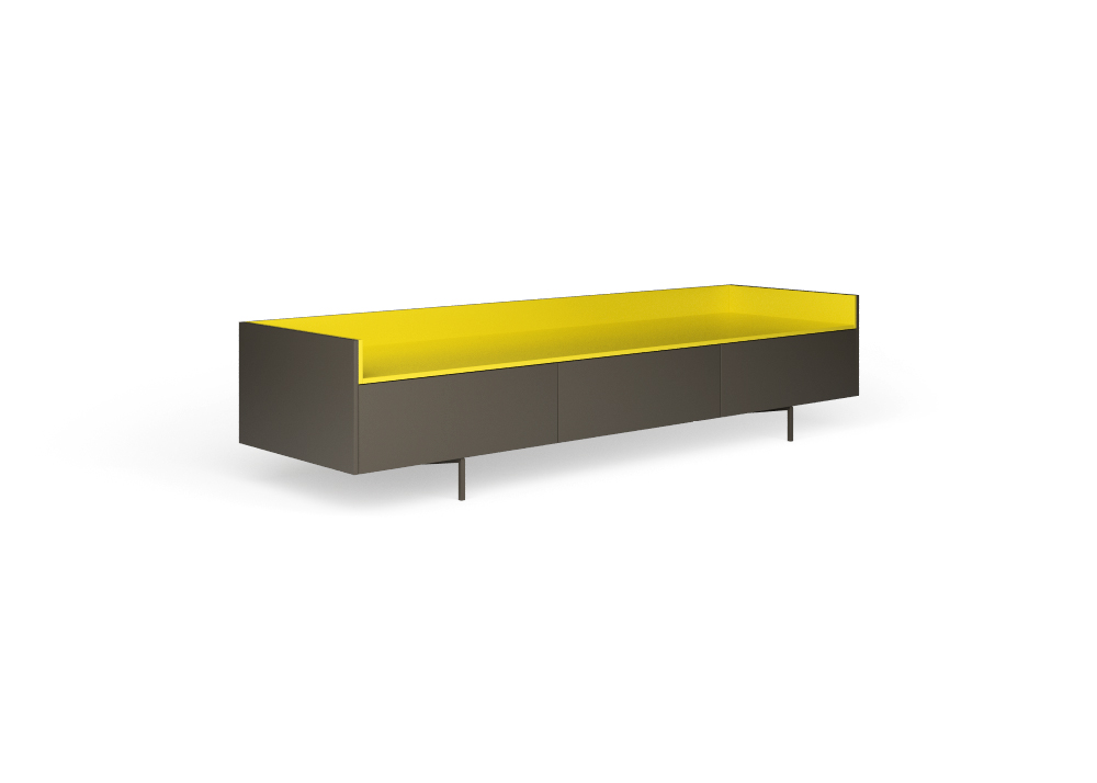 Base con tre cestoni. Piede Z. Box fango-Vassoio acido e Box petrolio-Vassoio senape. Variante: Box bianco-Vassoio verde.
