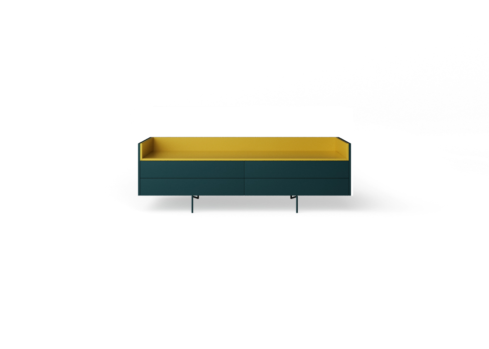 Base con quattro cassetti. Piede Z. Box petrolio-Vassoio senape e Box fango-Vassoio acido. Variante: Box corda-Vassoio azzurro.