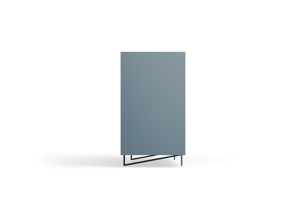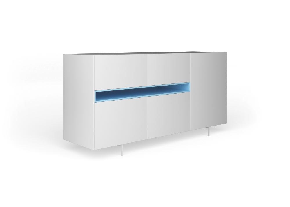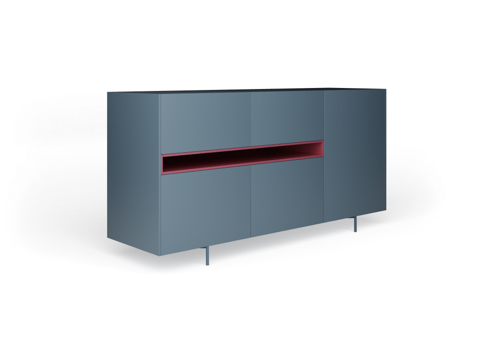 Credenza con cinque ante e vano a giorno. Piede Z. Box avio-Vassoio lampone. Variante: Box bianco-Vassoio azzurro.