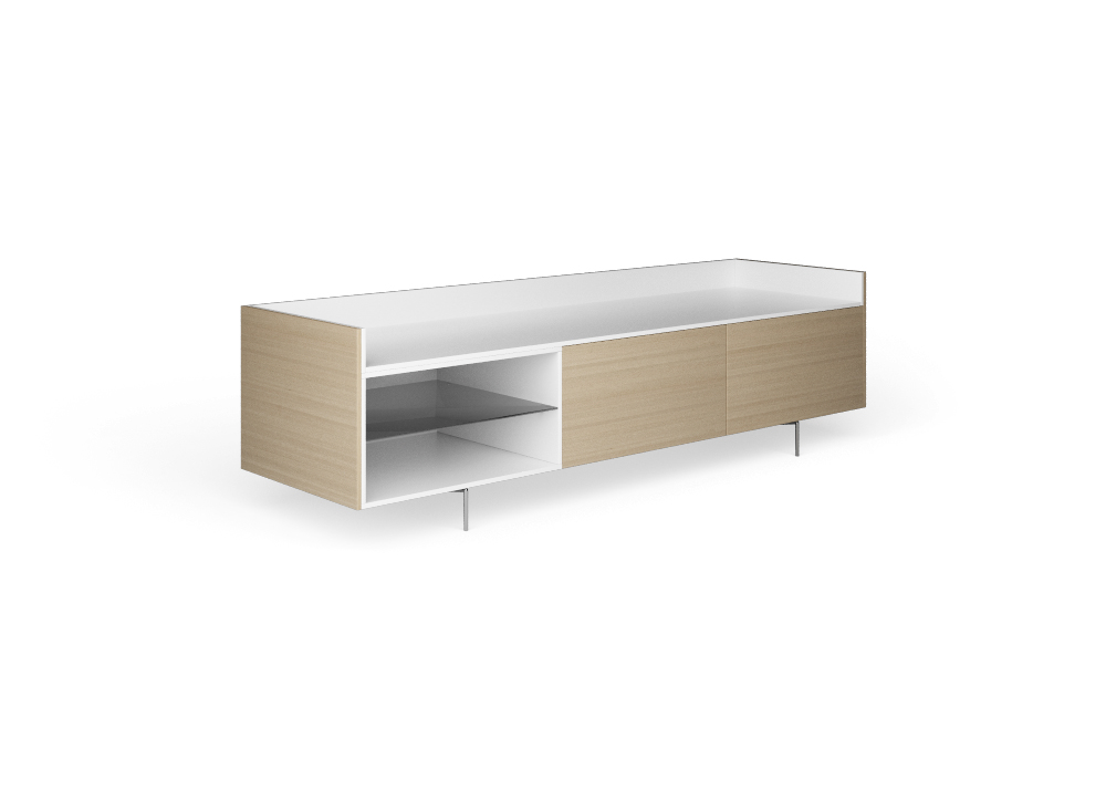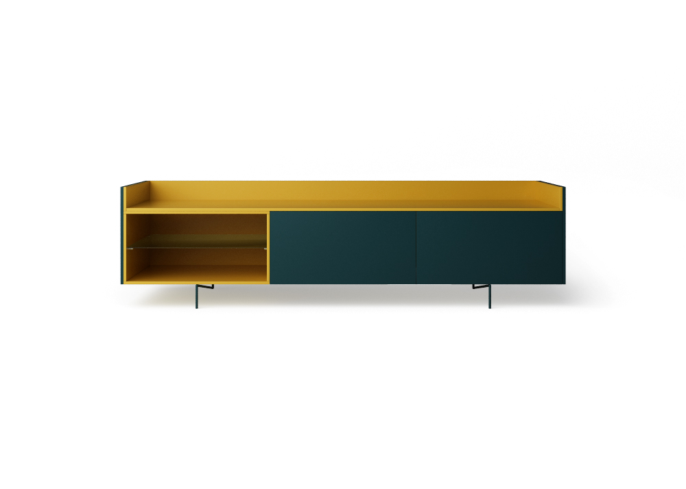 Madia con due ante e vano a giorno. Piede Z. Box petrolio-Vassoio senape. Variante: Box frassino canapa-Vassoio bianco.