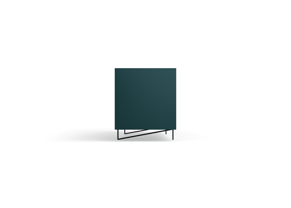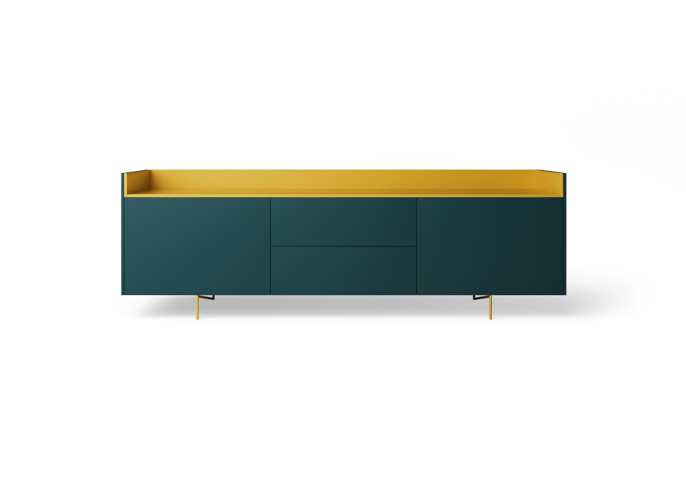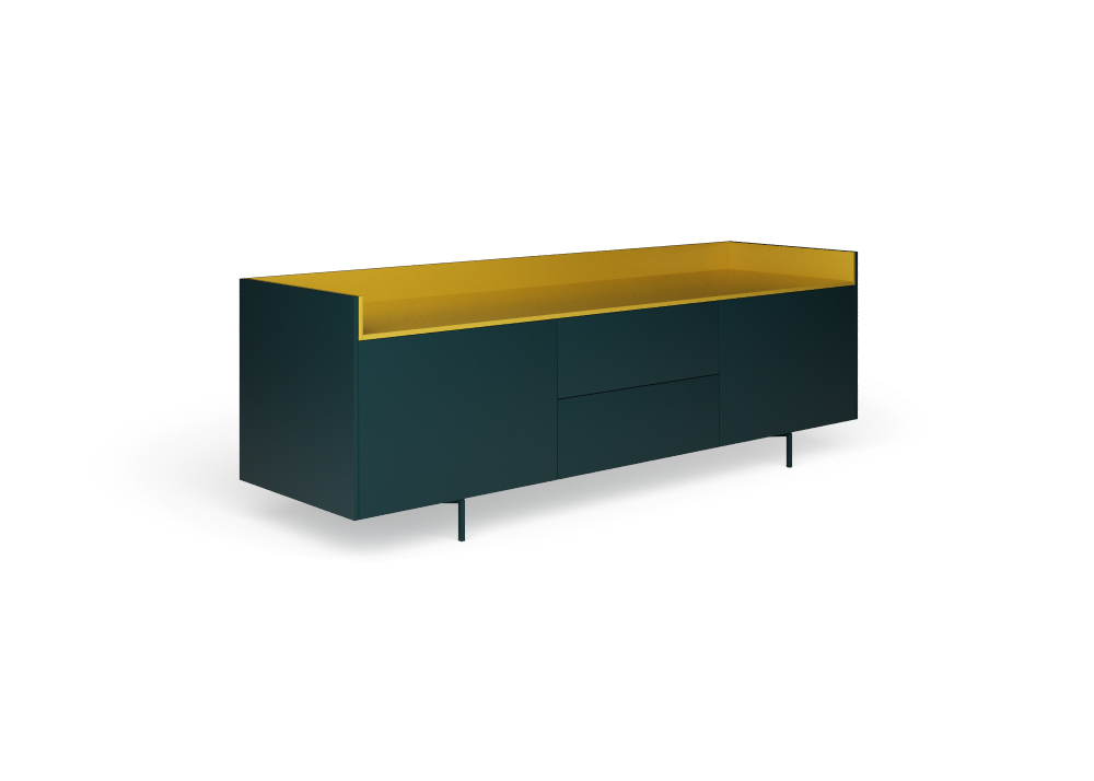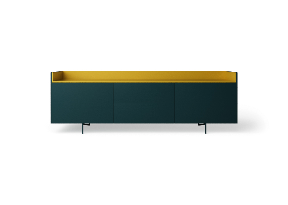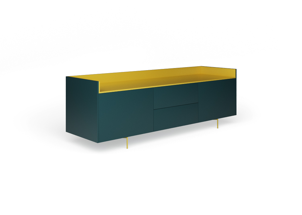 Madia con due ante e due cestoni. Piede Z. Box petrolio-Vassoio senape. Variante: Box bianco-Vassoio azzurro.