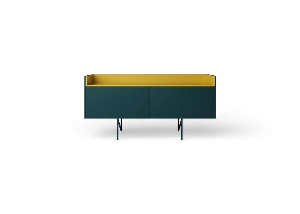 Madia con due ante. Piede Z. Box petrolio-Vassoio senape. Variante: Box olmo ossido-Vassoio bianco.