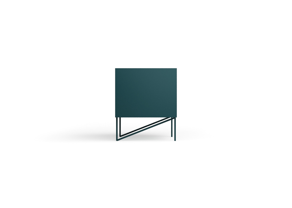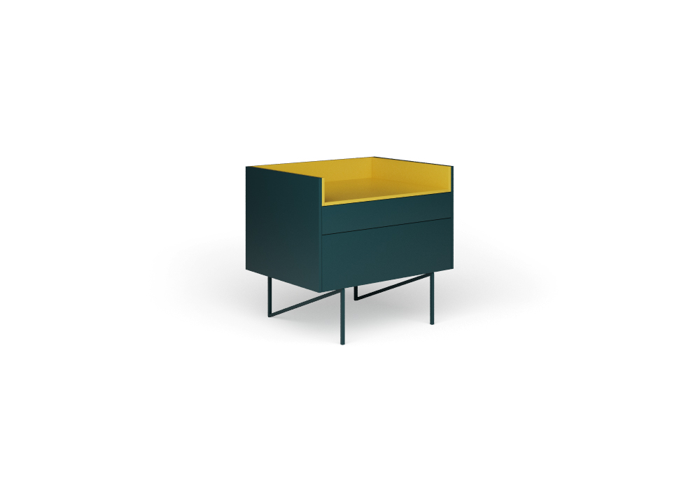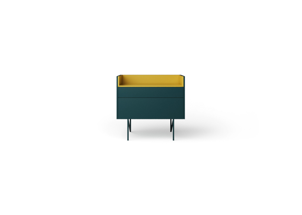 Madia con un cassetto e un cestone. Piede Z. Box petrolio-Vassoio senape. Variante: Box bianco-Vassoio arancio.
