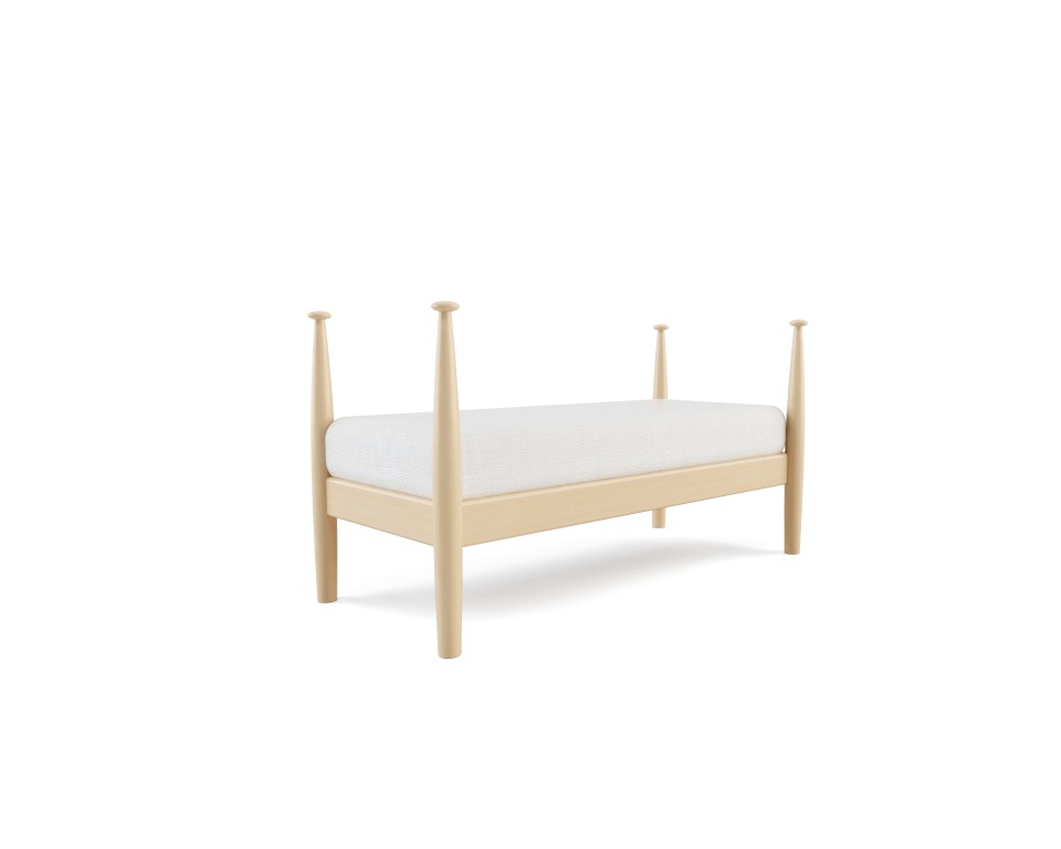 Panchetta in masso di faggio naturale e cuscini in lino bianco.