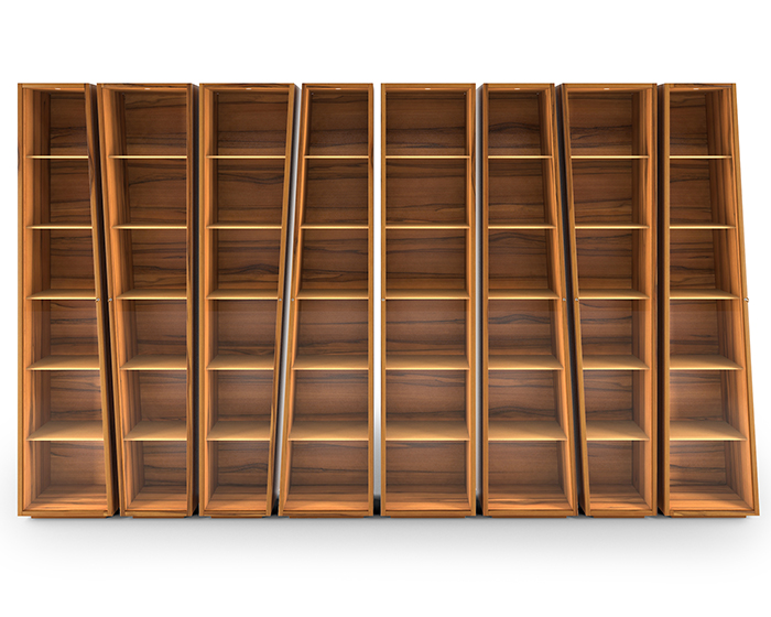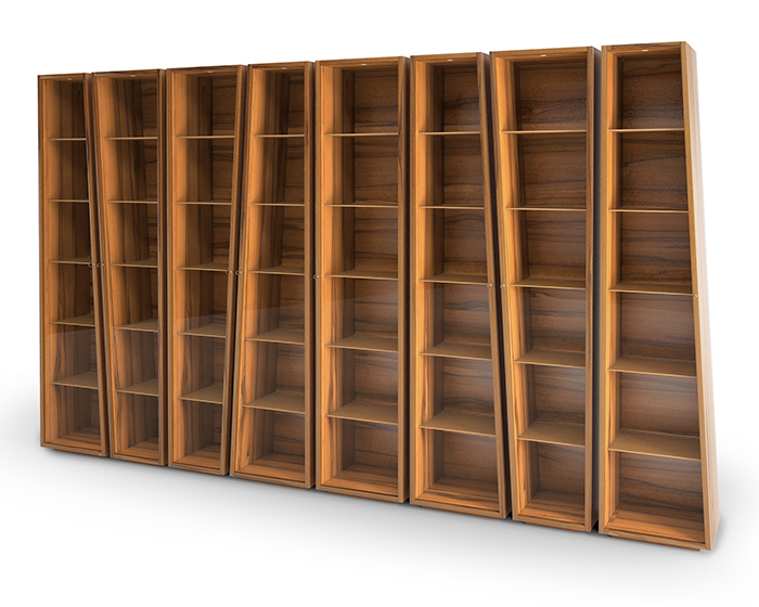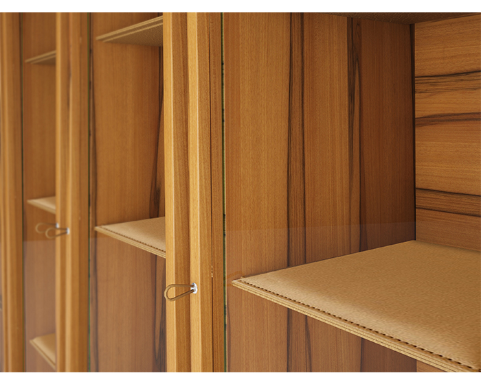 Finiture: Legno, Laccato opaco. Ripiani in cuoio, vetro o legno. Maniglia in cuoio.