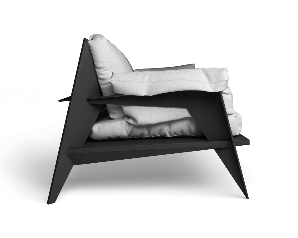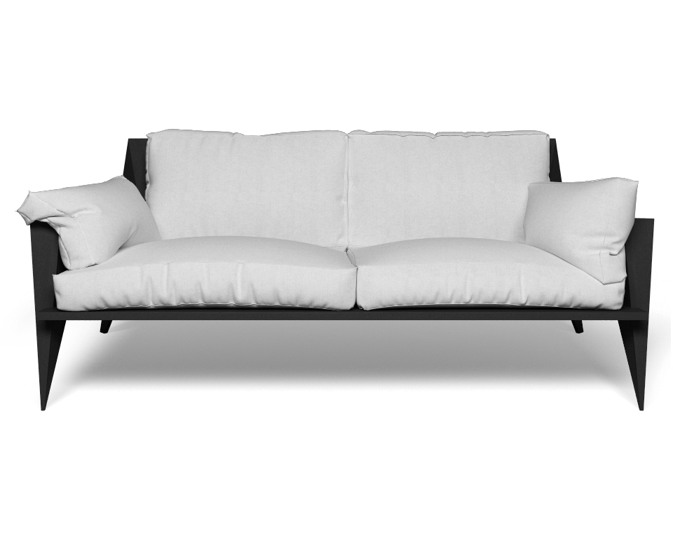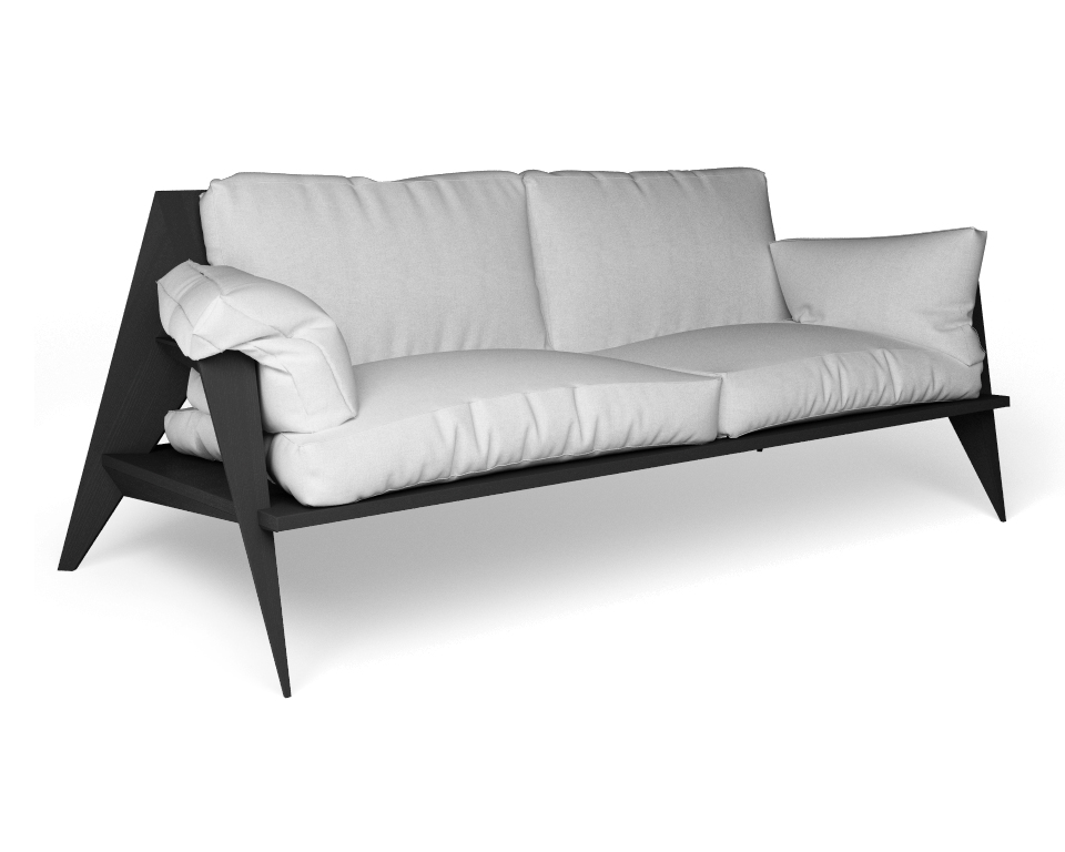 Divano in frassino verniciato nero e cuscini in lino bianco